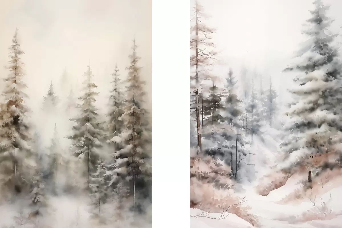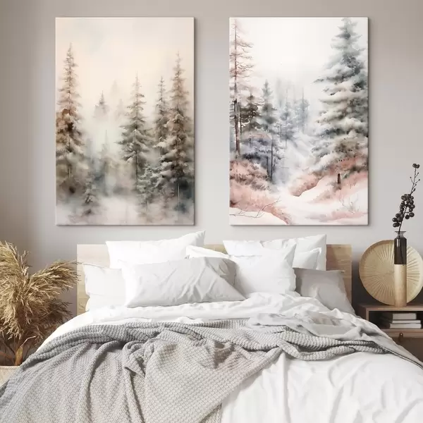 Pictură pe pânză Pini înalți acoperiți de zăpadă, în picioare într-o pădure încețoșată, o scenă de iarnă blândă și liniștită Nr m01011