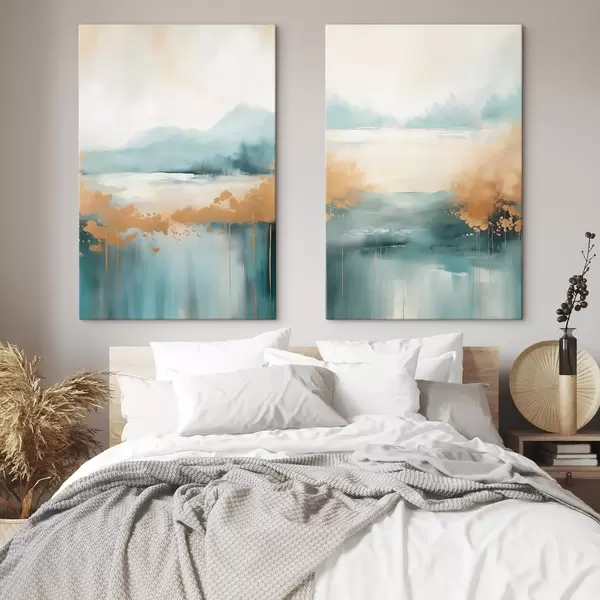 Pictură pe pânză Peisaj abstract cu munți și lac în nuanțe de verde-albastru și galben texturat, pensule moi, operă de artă minimalistă Nr m01012