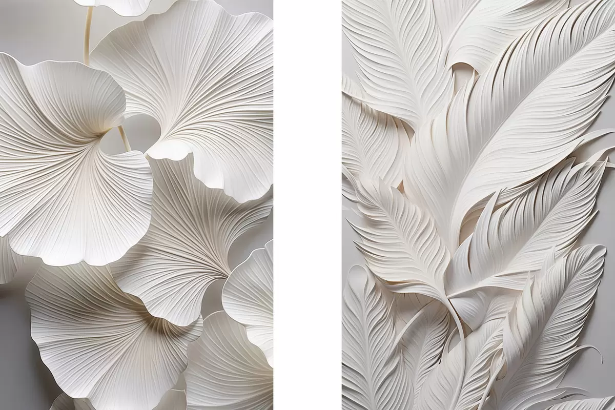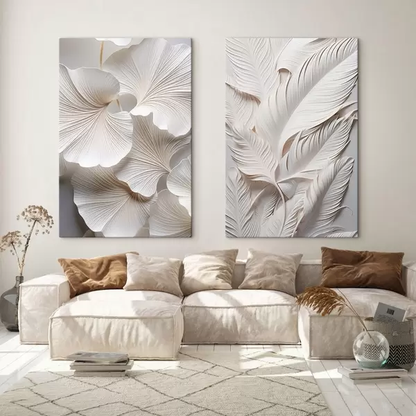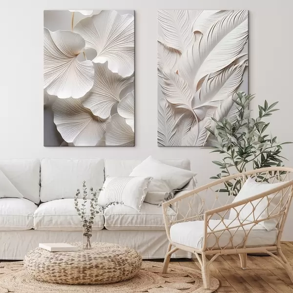 Pictură pe pânză Frunze albe de ginkgo și frunze lungi cu detalii complexe, creând un efect texturat și stratificat, artă minimalistă Nr m01013