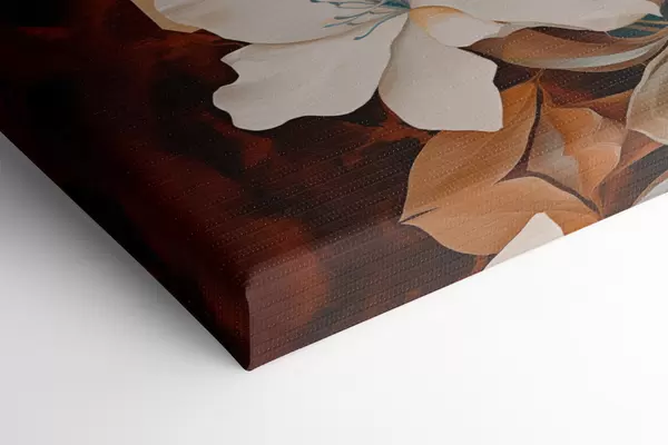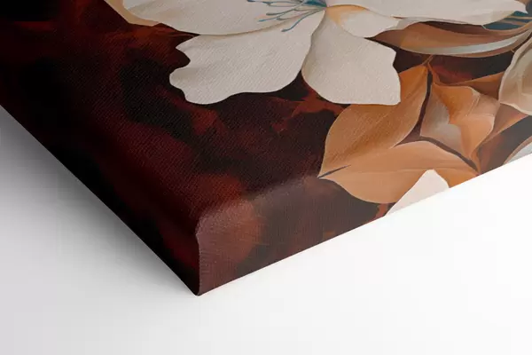 Pictură pe pânză Flori și frunze albe abstracte pe un fundal maro și albastru cu forme abstracte, într-un stil minimalist Nr m01015