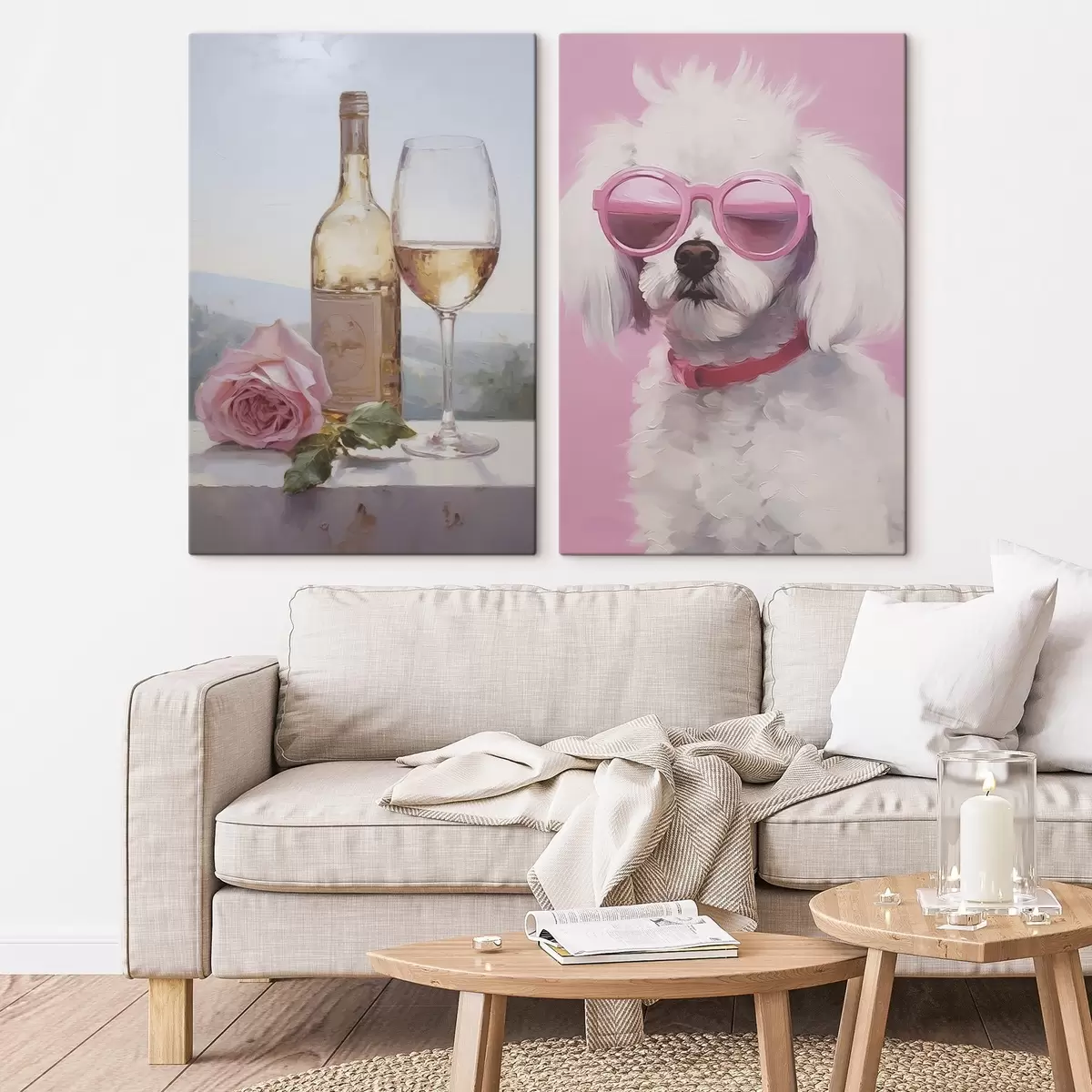 Pictură pe pânză O sticlă și un pahar de vin și un pudel cu ochelari, pictură imitație Nr m01021