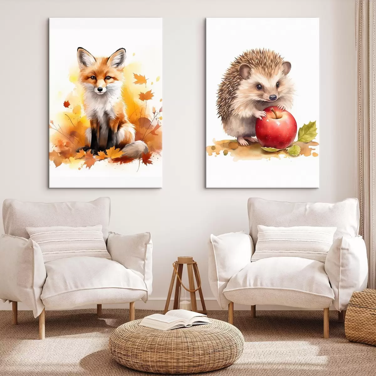 Pictură pe pânză Vulpe și arici, acuarelă imitație Nr m01050