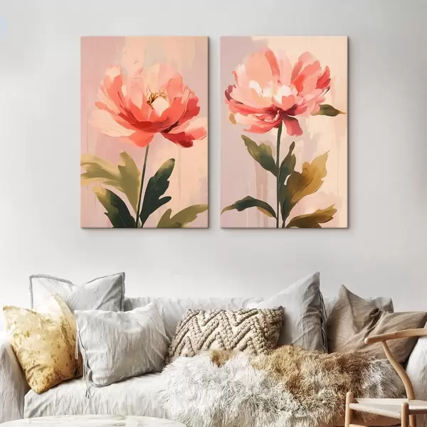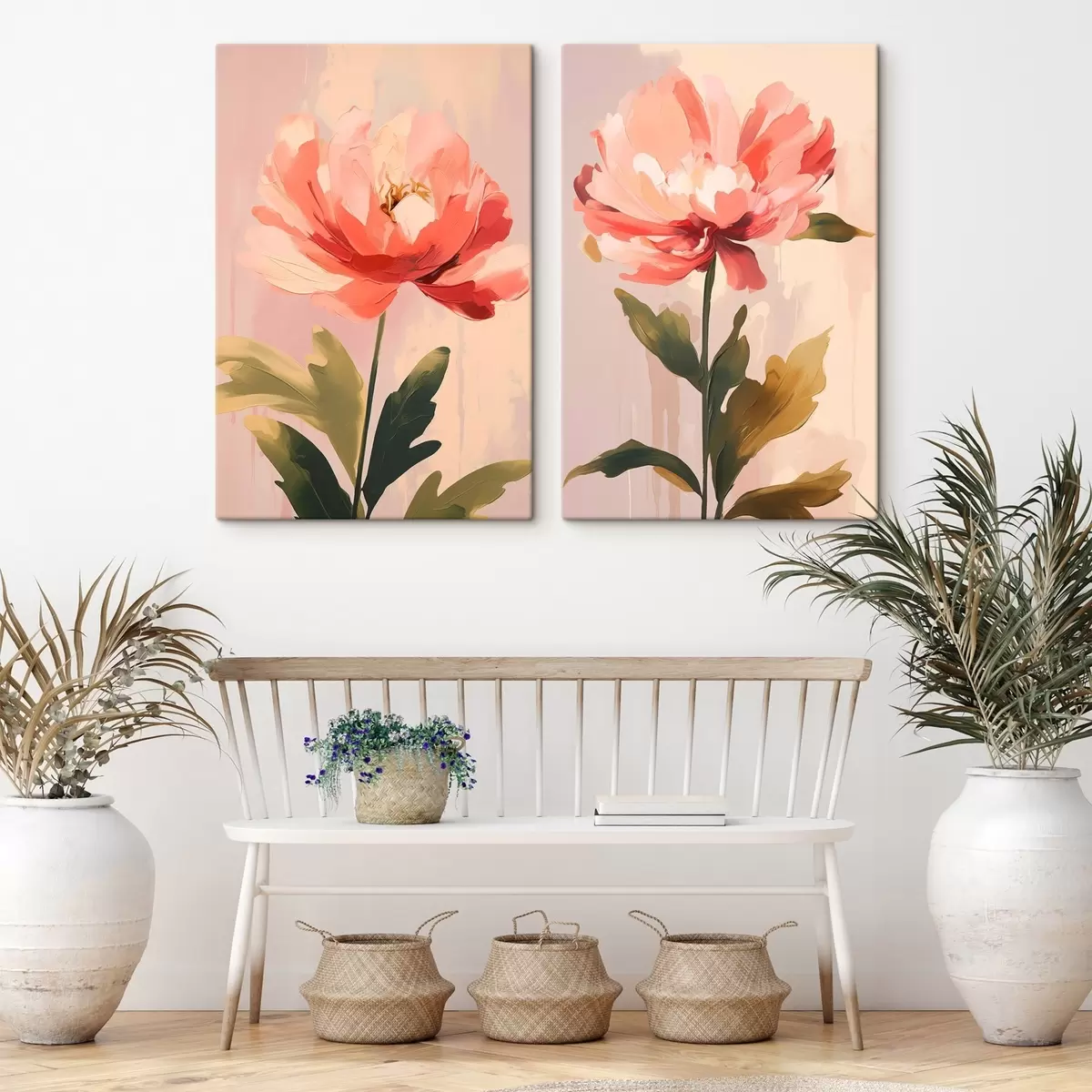 Pictură pe pânză Bujori pastel pe tulpini înalte, în nuanțe calde de roz Nr m01093