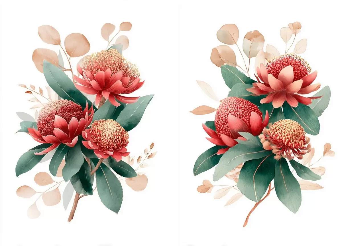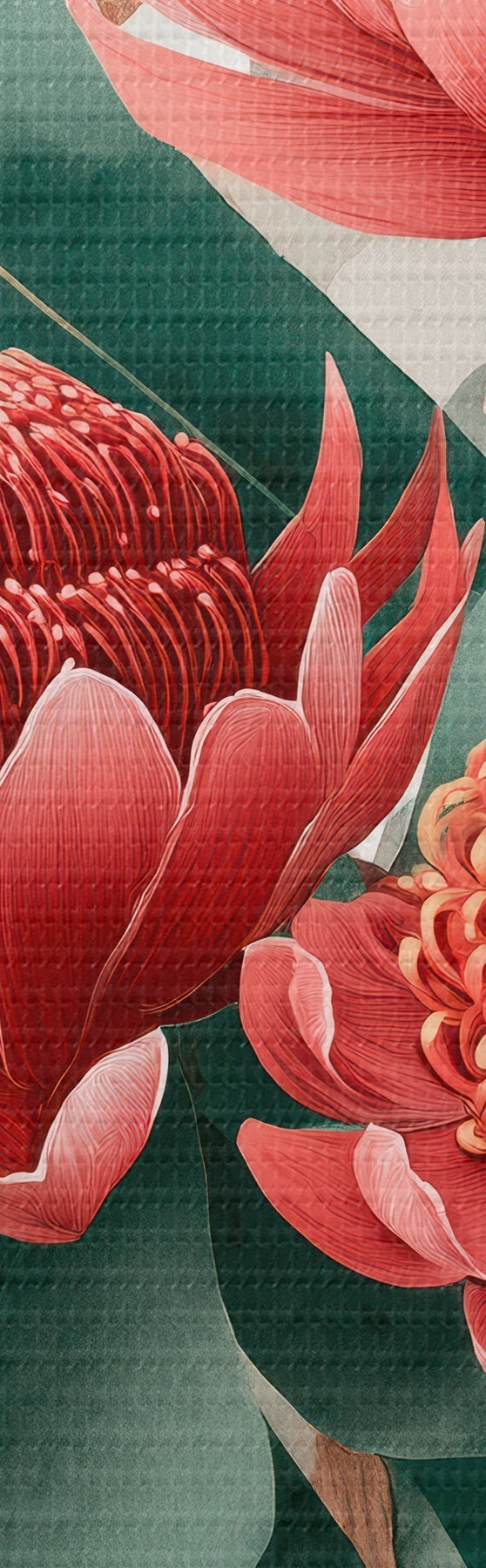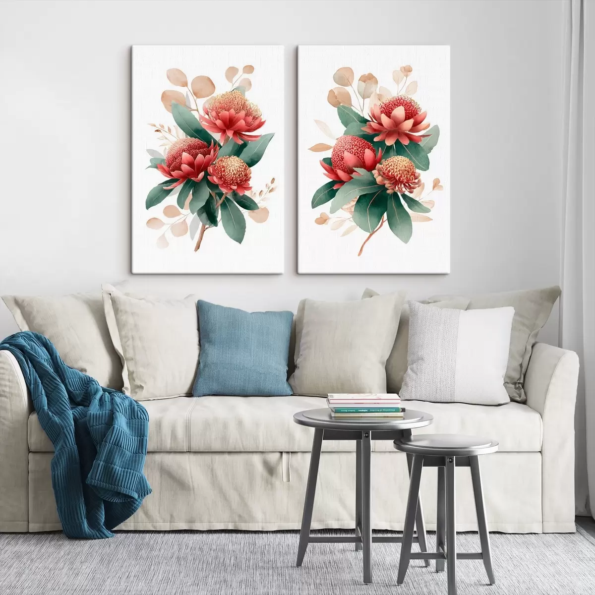 Pictură pe pânză Compoziție florală cu protee într-o paletă de culori roșu-coral pe fond alb Nr m01096