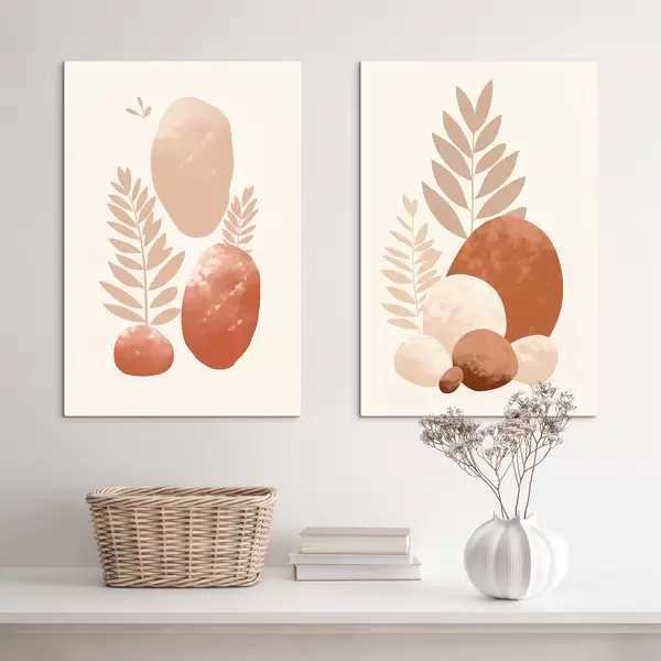 Pictură pe pânză Forme abstracte, pietre texturate și frunze în nuanțe discrete de piersică și teracotă, fundal minimalist, crem Nr m01114