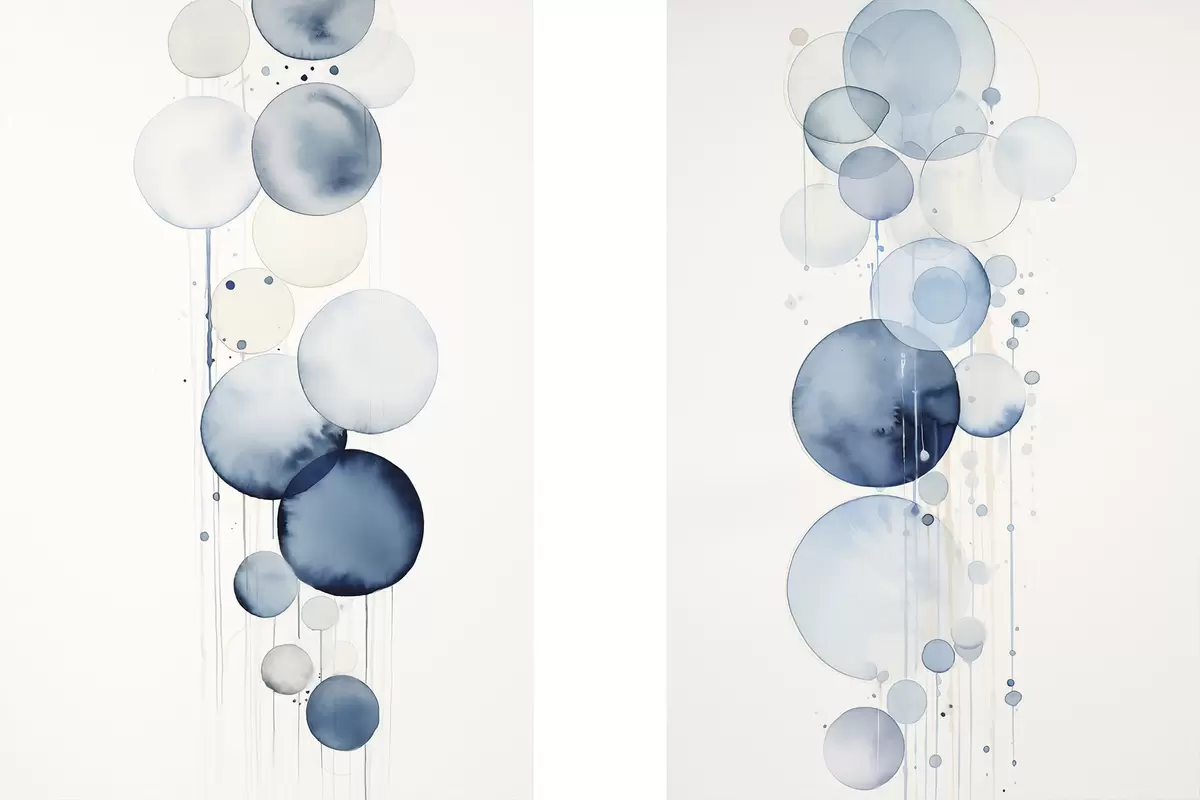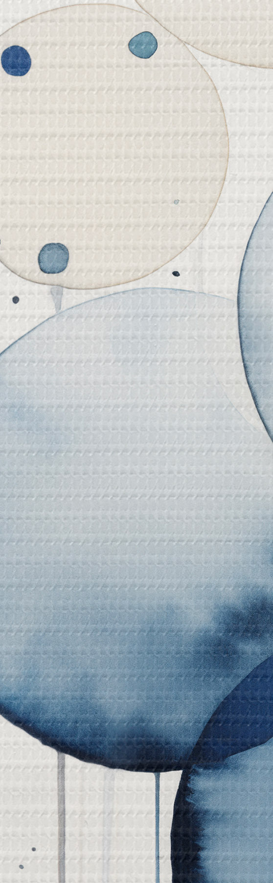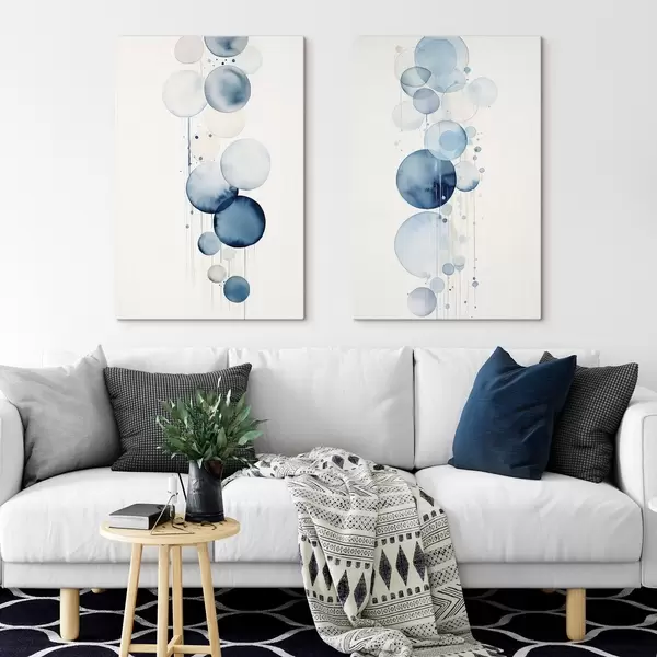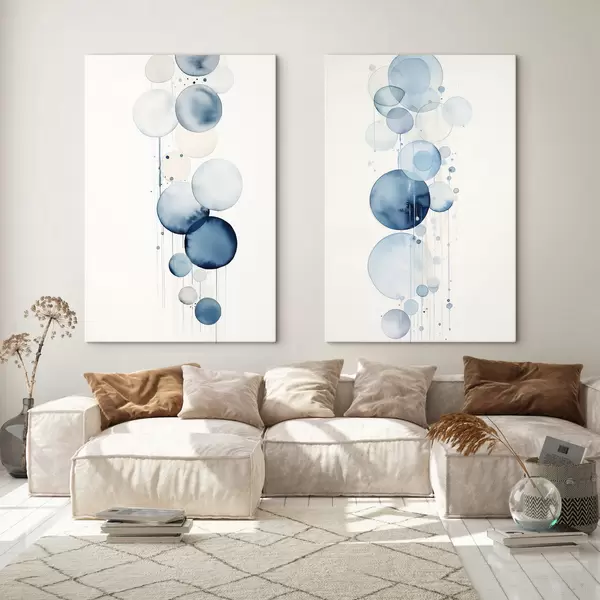 Pictură pe pânză Cercuri abstracte texturate albastre și albe, de diferite dimensiuni, pe fond alb Nr m01118