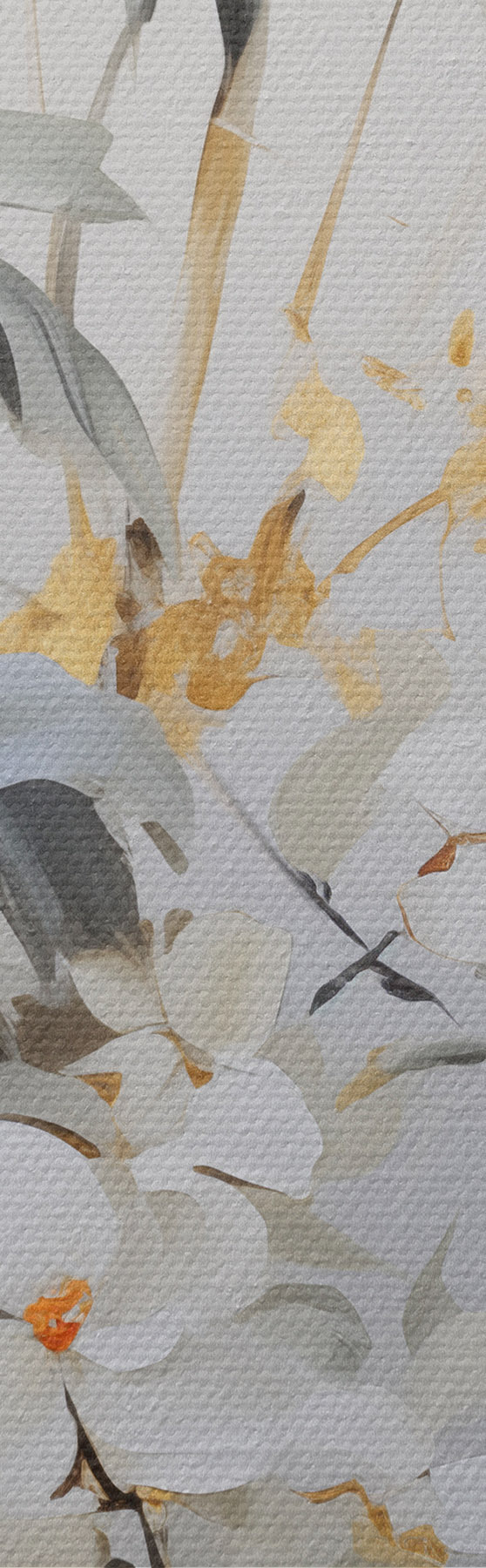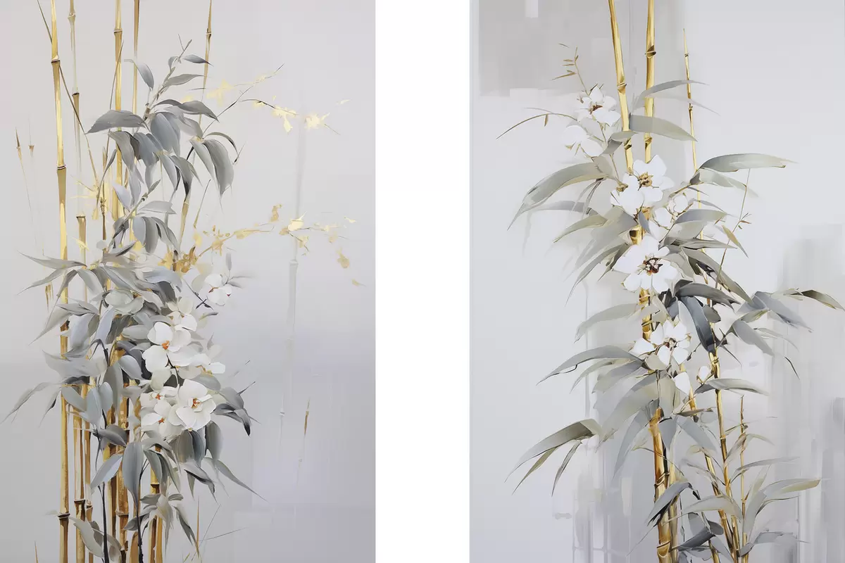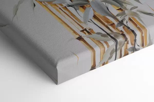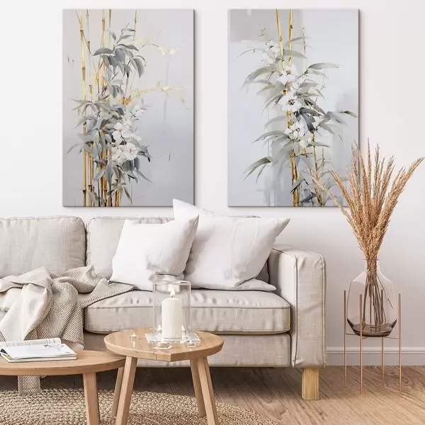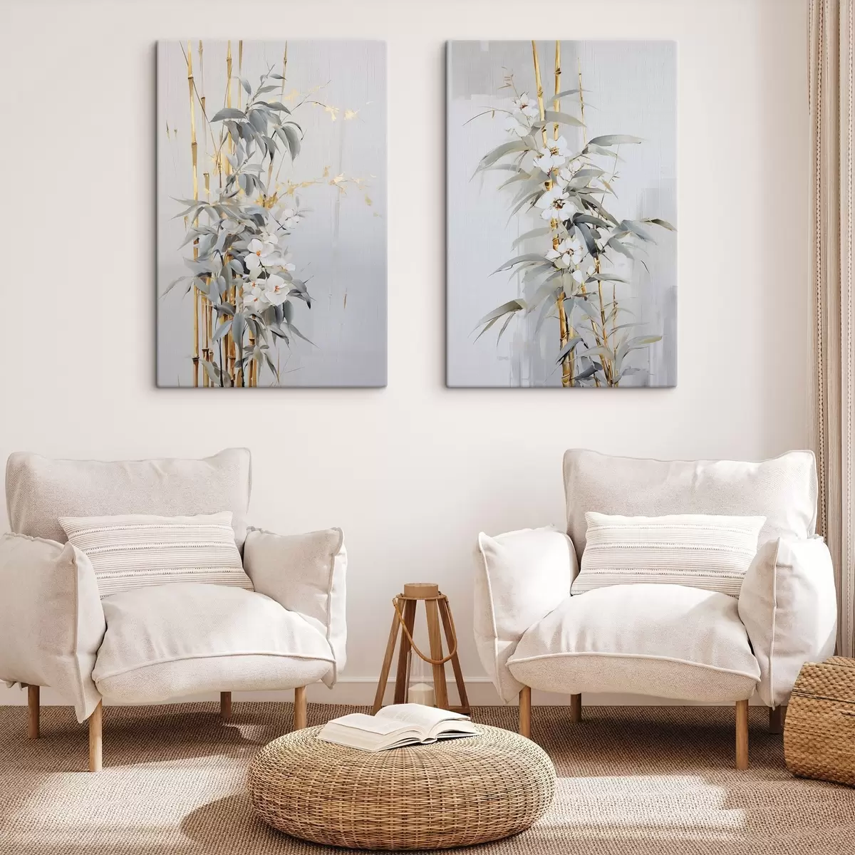 Pictură pe pânză Tulpini abstracte de bambus cu accente galbene, flori albe delicate și frunze verde pal, fundal gri Nr m01127