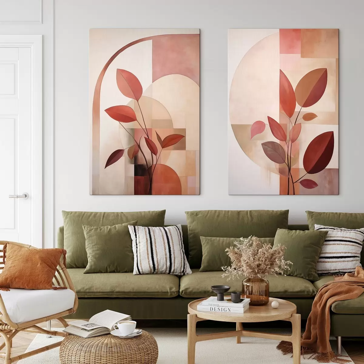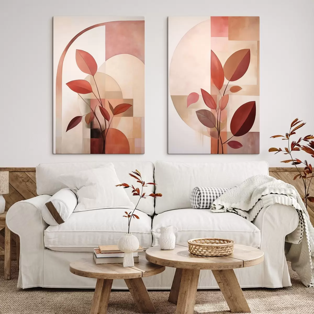 Pictură pe pânză Plantă abstractă cu frunze roșii pe un fundal de forme geometrice și culori delicate, discrete Nr m01128