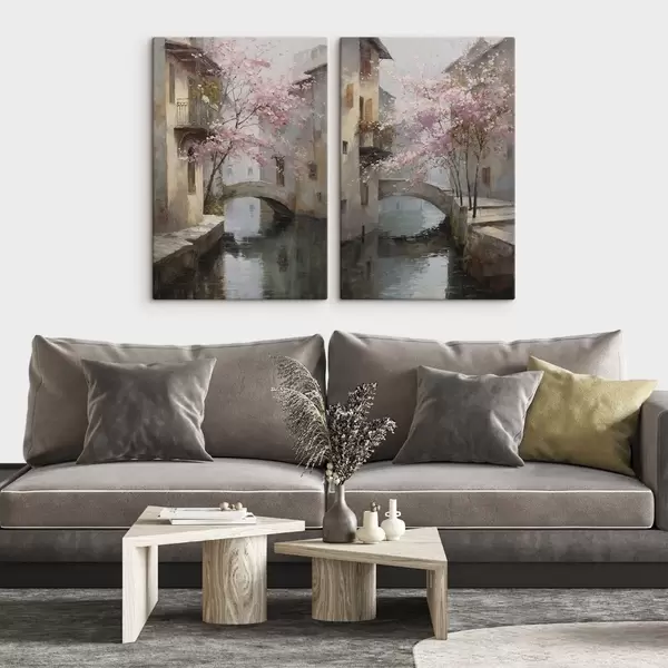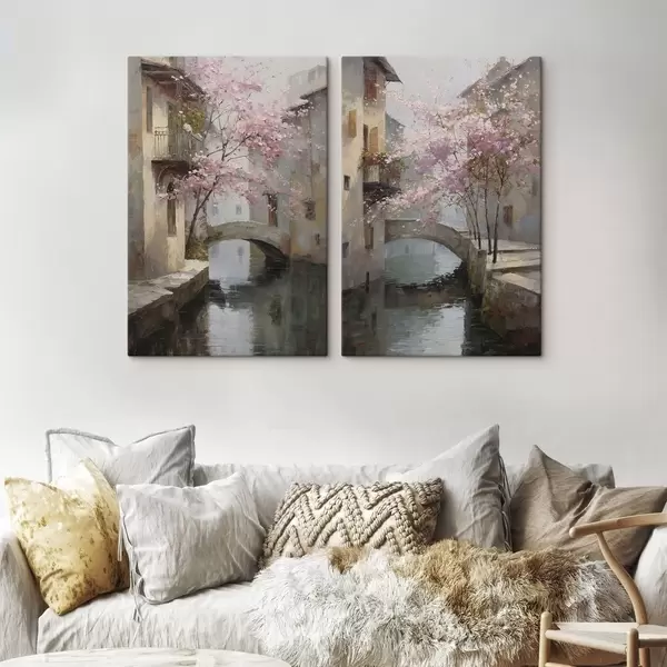 Pictură pe pânză peisaj urban romantic cu un copac înflorit în stilul picturii în ulei Nr m01173