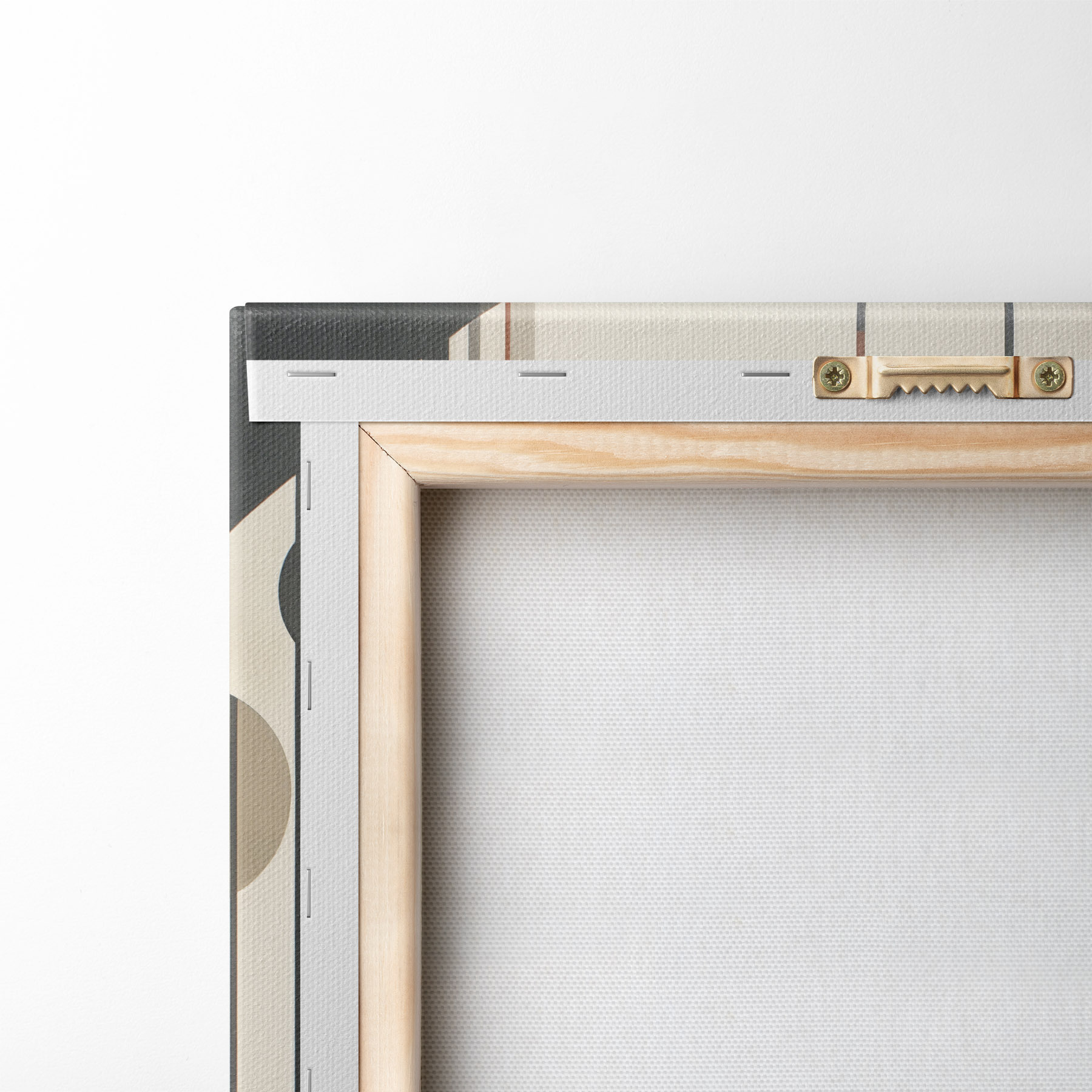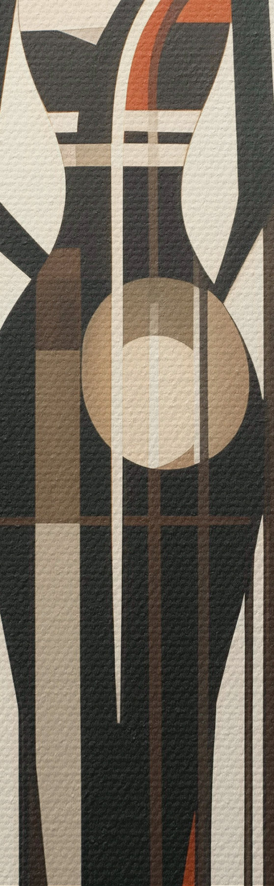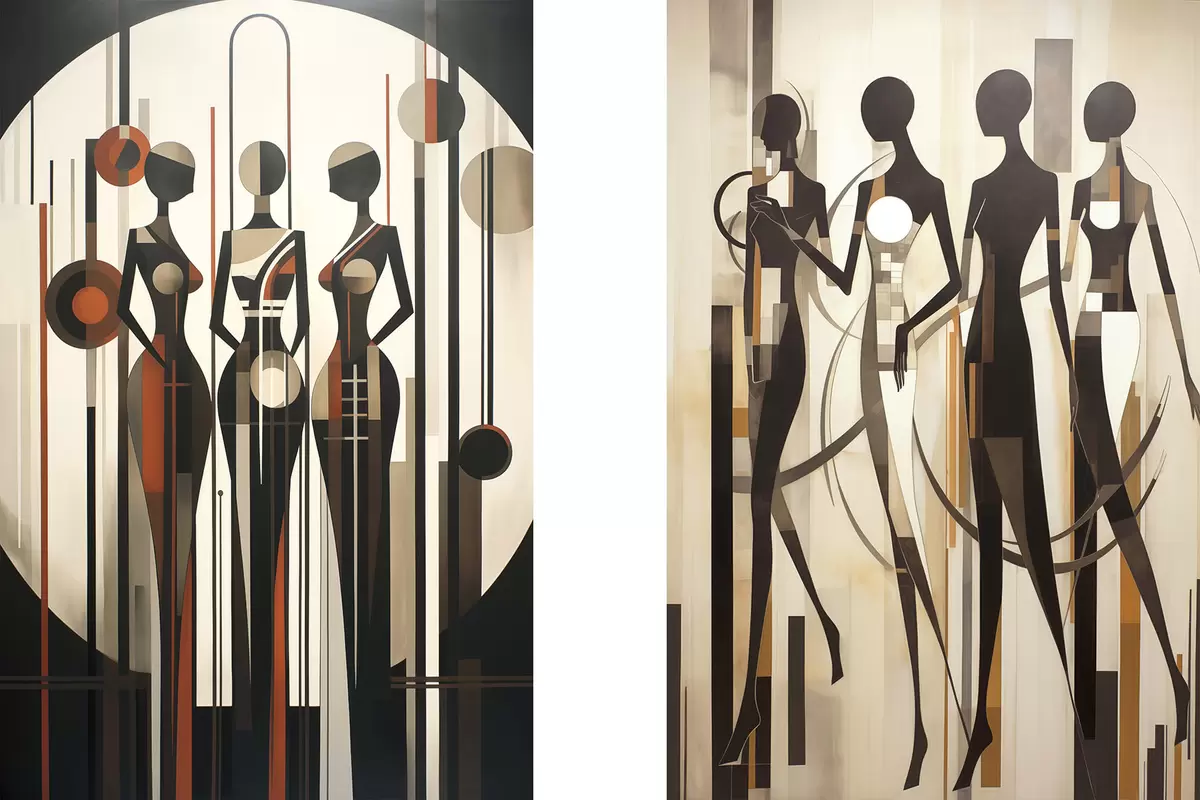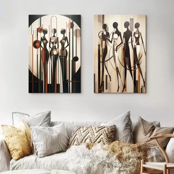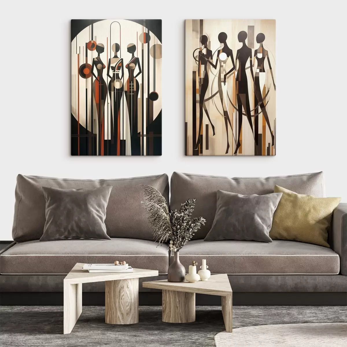 Pictură pe pânză Figuri feminine stilizate cu elemente geometrice pe un fundal abstract format din linii verticale și cercuri Nr m01237