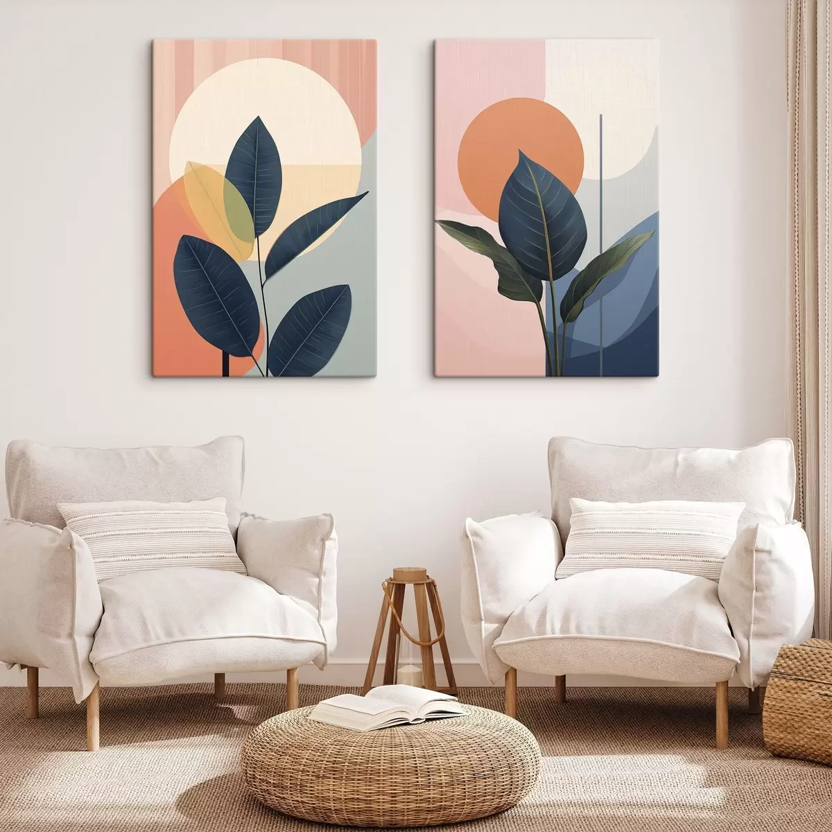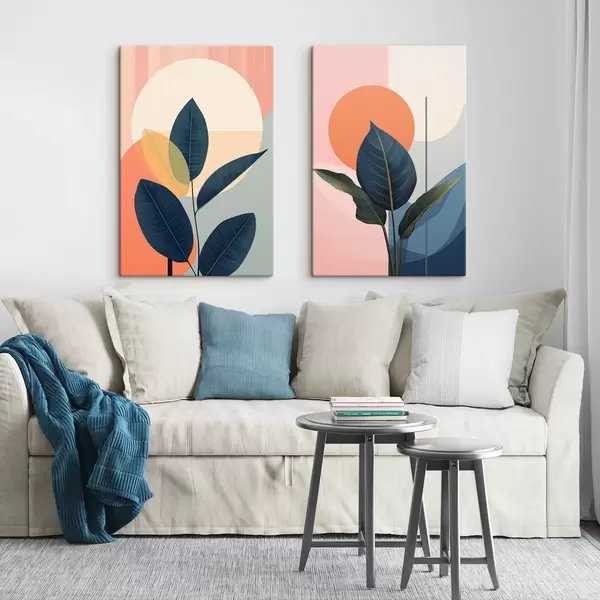 Pictură pe pânză Frunze întunecate pe un fundal de forme abstracte în nuanțe de piersic și gri, cu un cerc mare, de culoare galben pal Nr m01238