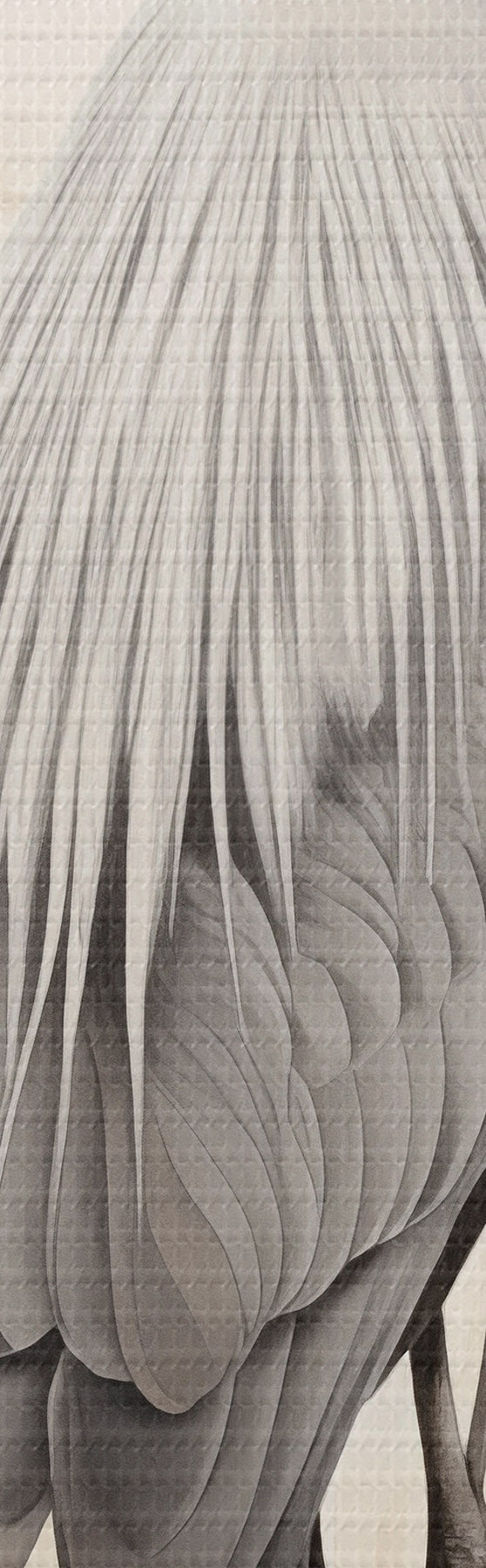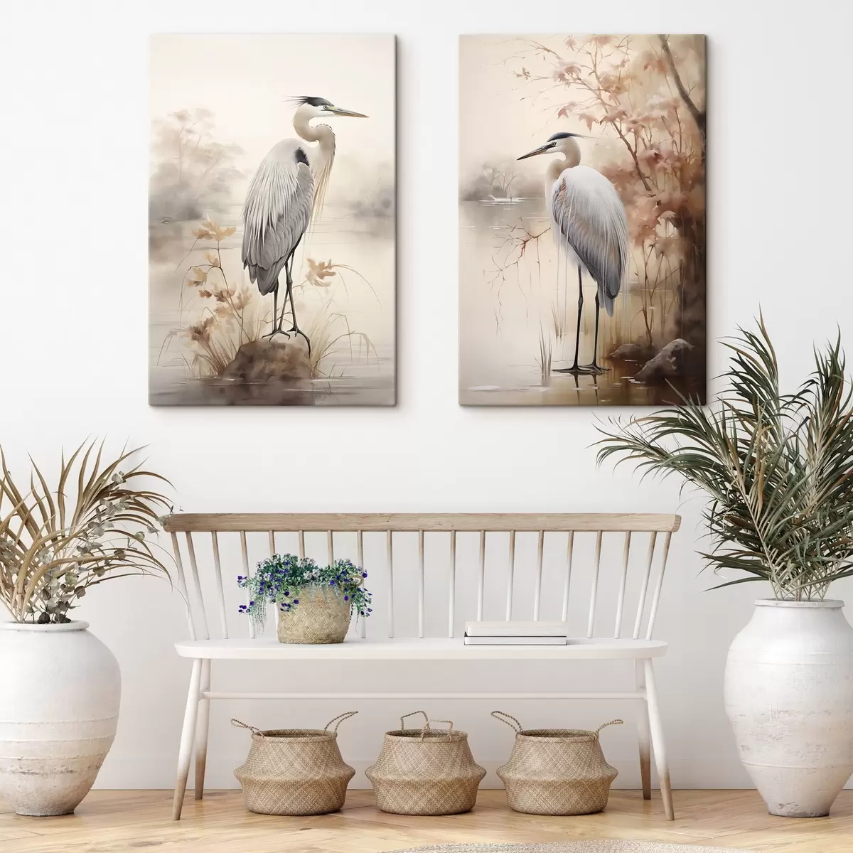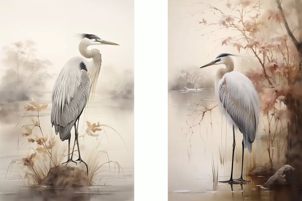 Pictură pe pânză O stârcă stă pe o stâncă într-un lac, cu iarbă înaltă și copaci în fundal. Nr m01239