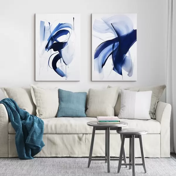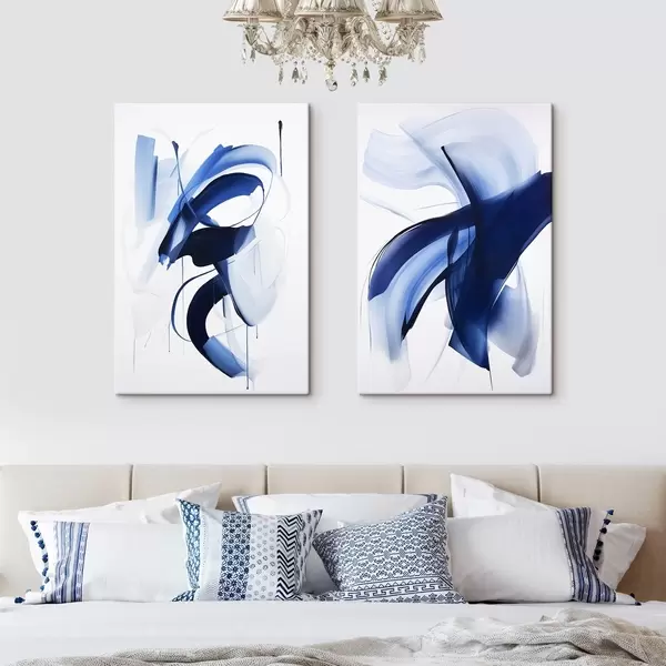 Pictură pe pânză Forme abstracte albastre asemănătoare cu pensulele, cu linii și curbe fluide pe fond alb, artă modernă Nr m01240