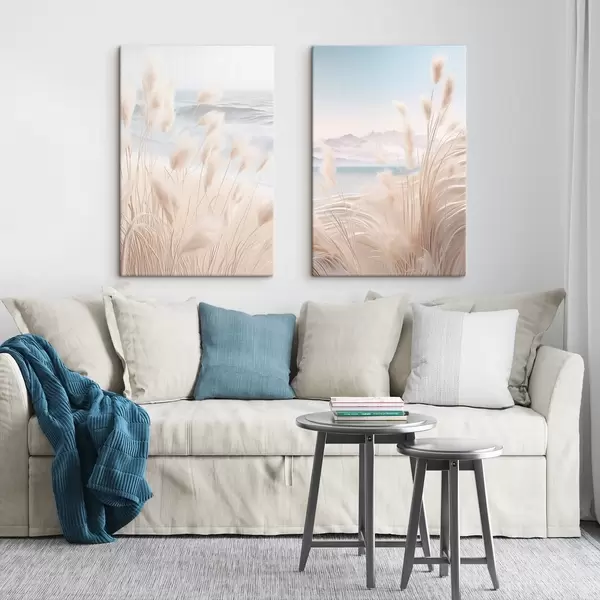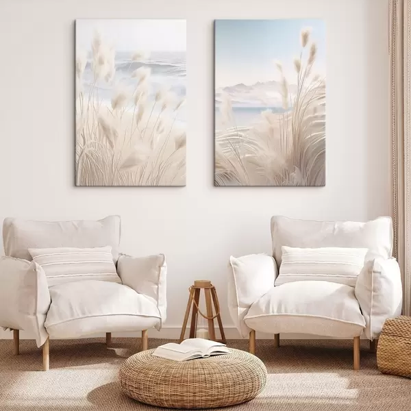 Pictură pe pânză Iarbă pampas înaltă și pufoasă, în nuanțe delicate de bej, în prim-plan, cu o plajă nisipoasă în fundal. Nr m01242