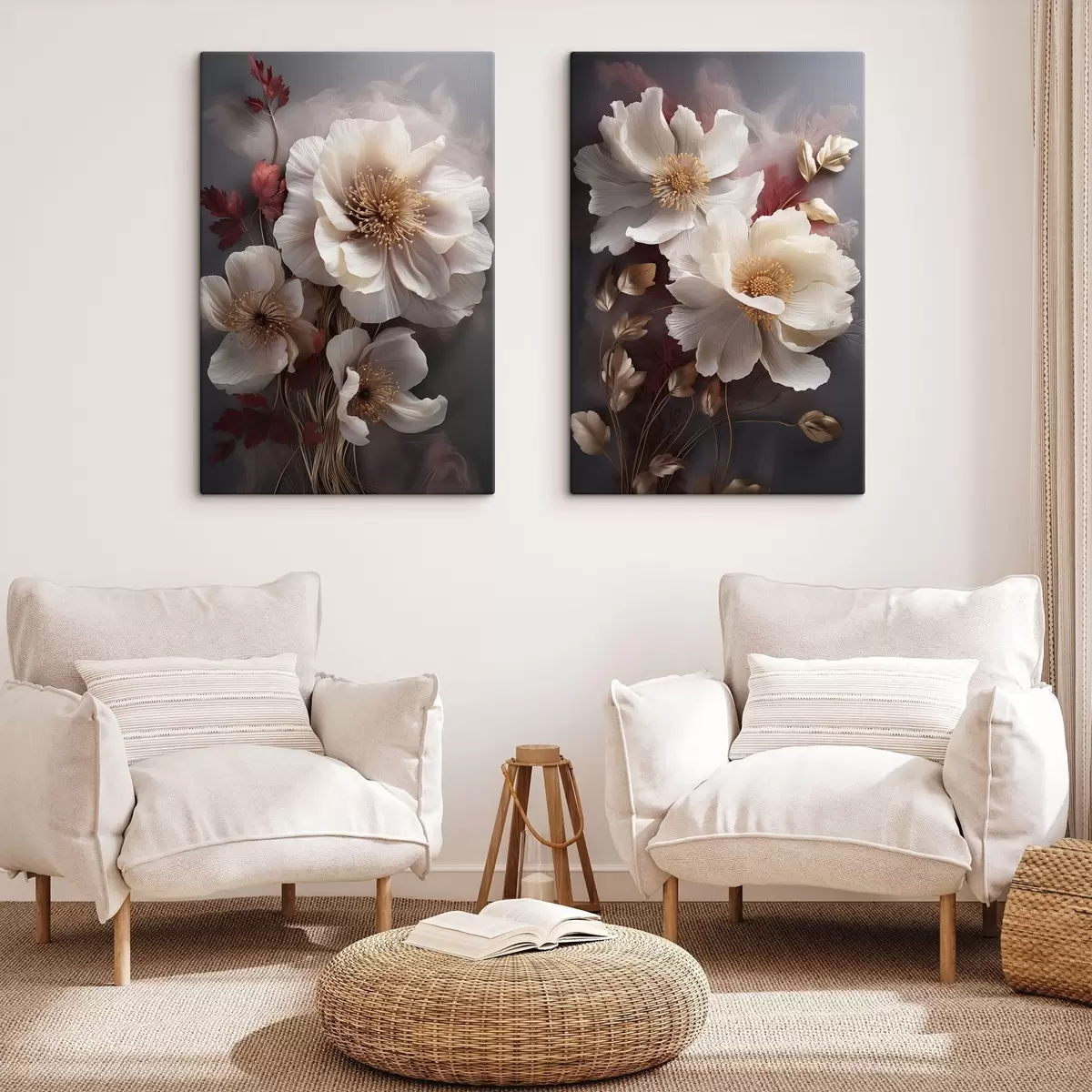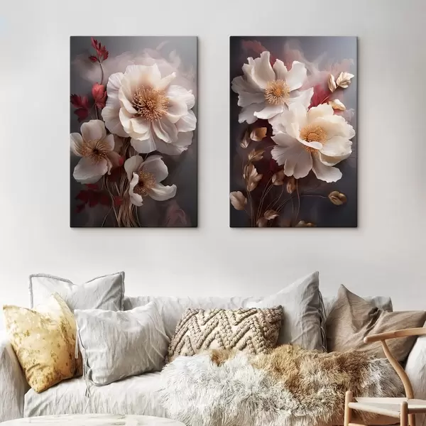 Pictură pe pânză Bujori delicați, cu petale subțiri și vaporoase, înconjurați de frunze roșii închise și galbene, pe un fundal abstract. Nr m01243