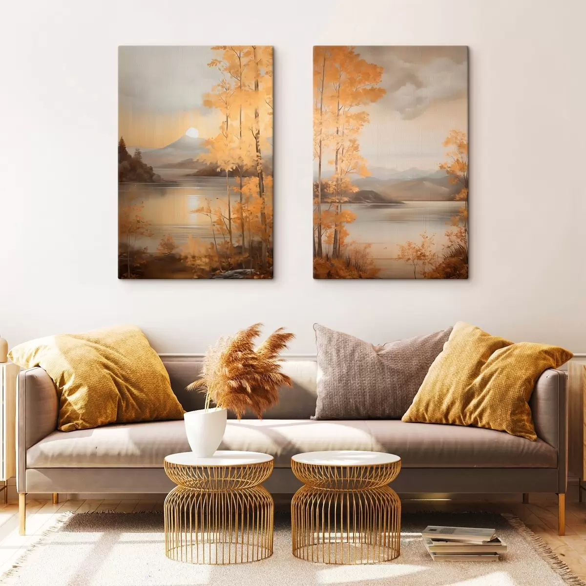 Pictură pe pânză Copacii cu frunze portocalii, specifici toamnei, încadrează un lac liniștit, cu munți îndepărtați, sub un cer înnorat. Nr m01246