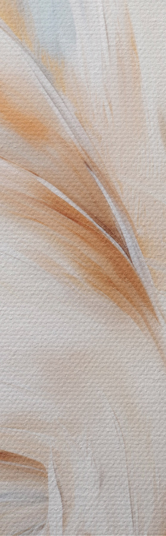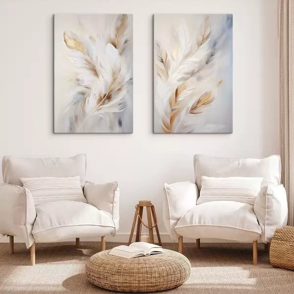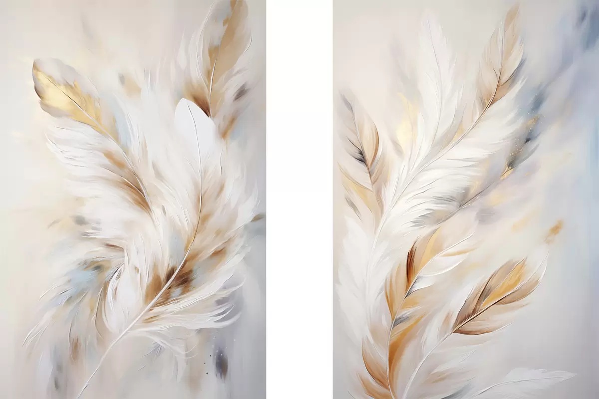 Pictură pe pânză Pene mari și moi, cu o combinație de nuanțe de alb, galben și maro, pe un fundal abstract și deschis. Nr m01247