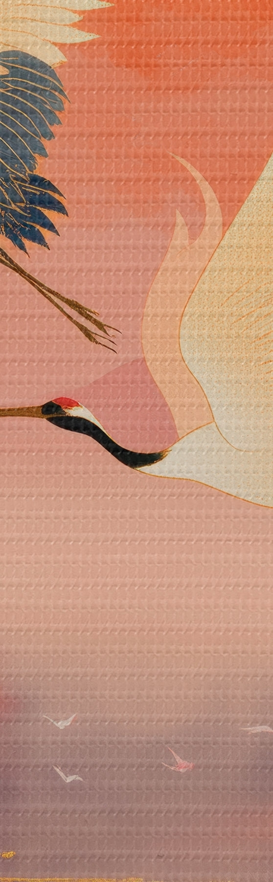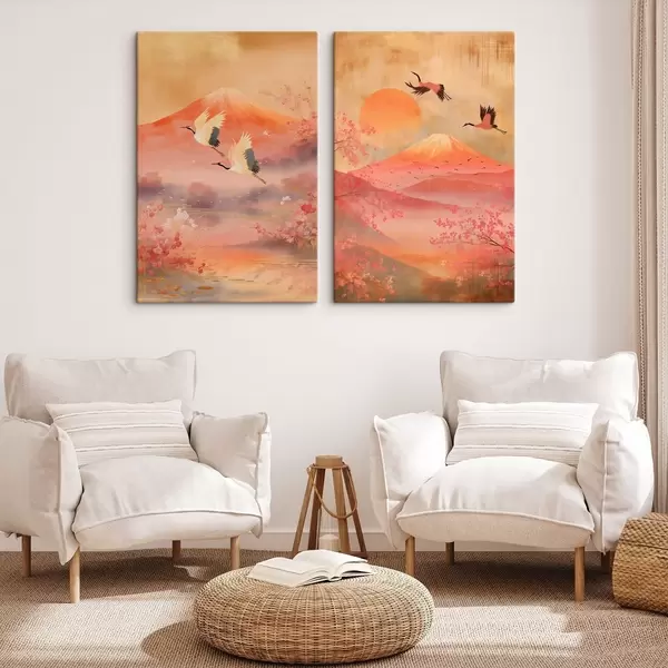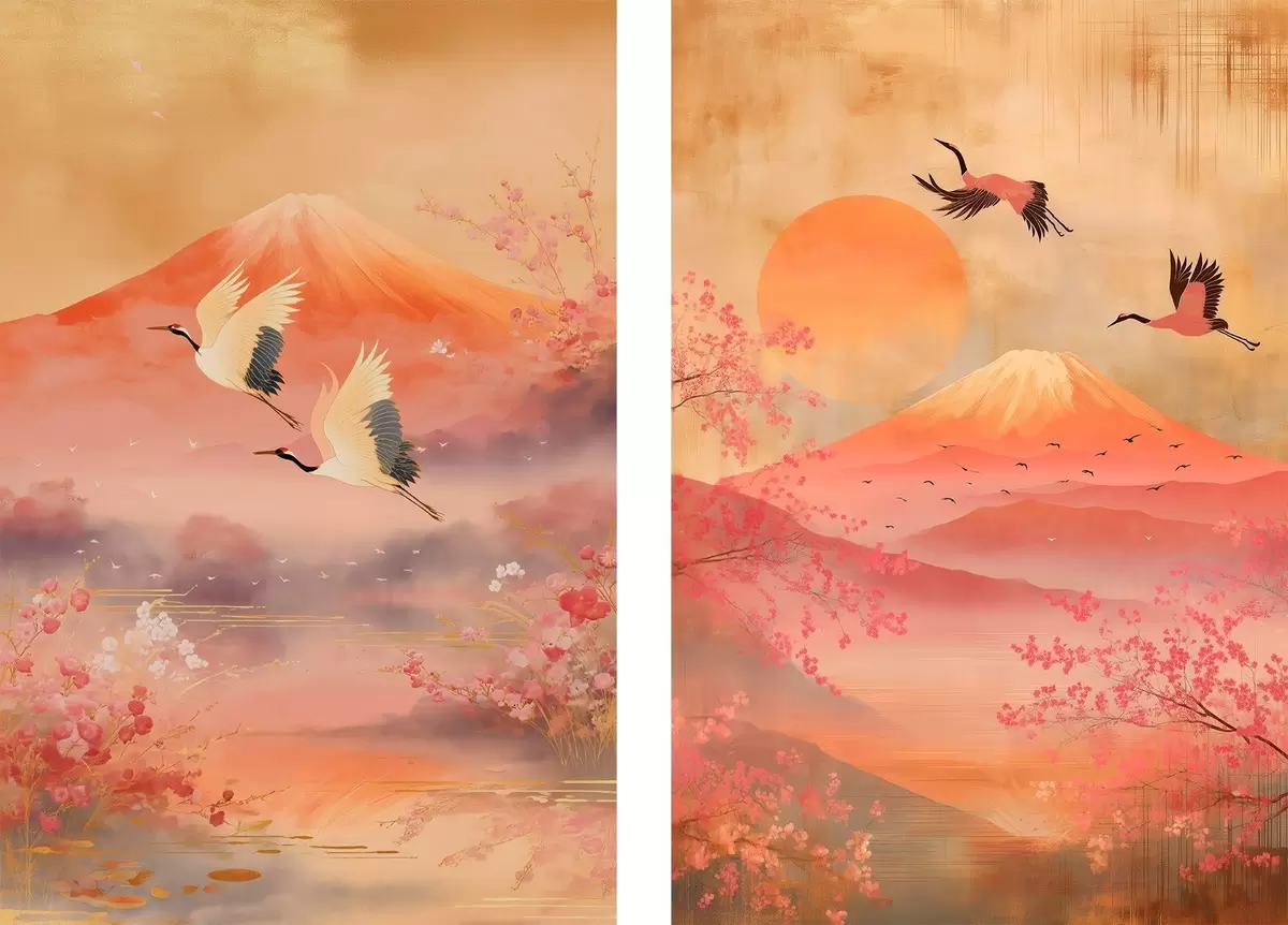 Pictură pe pânză Peisaj japonez cu cocori și Muntele Fuji într-un stil ilustrativ clasic Nr m30042