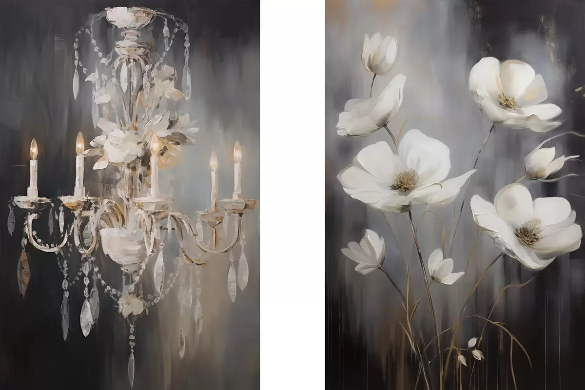 Pictură pe pânză Candelabru abstract ornamentat cu lumânări aprinse și artă florală, pe un fundal întunecat, texturat Nr m30049