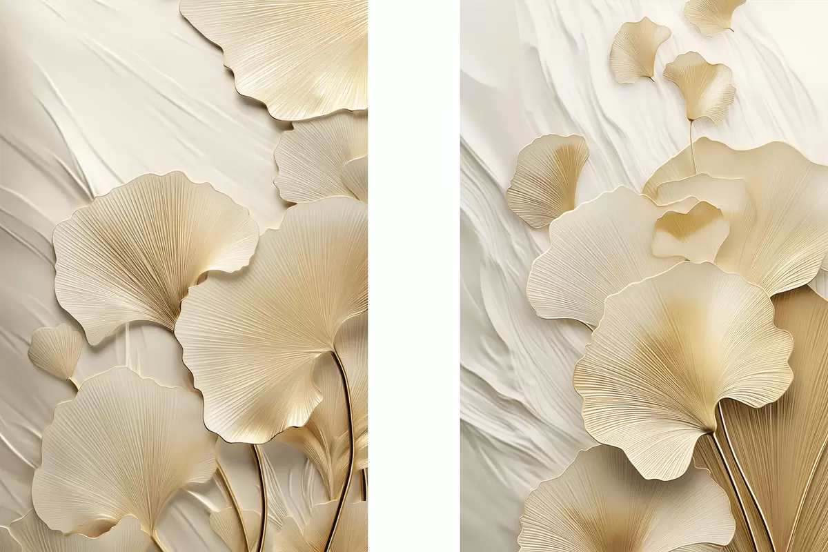 Pictură pe pânză Frunze abstracte de ginkgo pe un fundal texturat, deschis la culoare, compoziție elegantă și abstractă Nr m30054