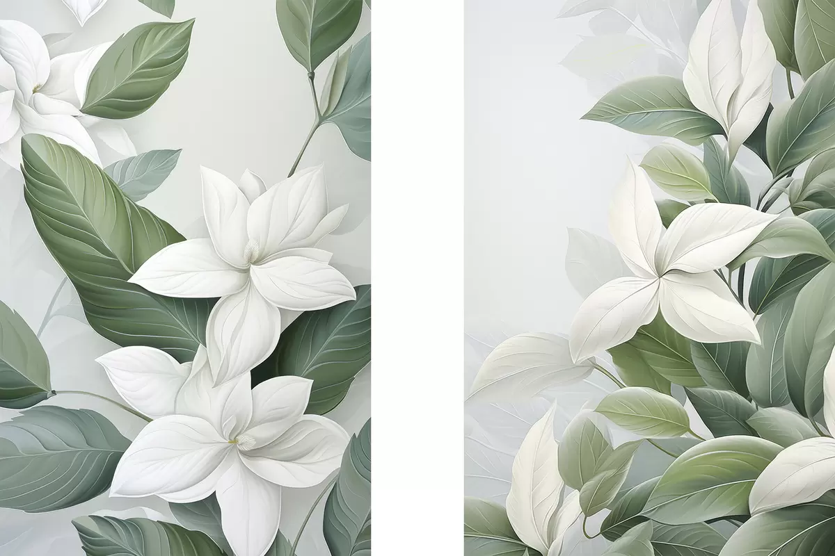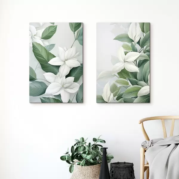 Pictură pe pânză Flori albe cu frunze verzi, fundal pastelat Nr m30055