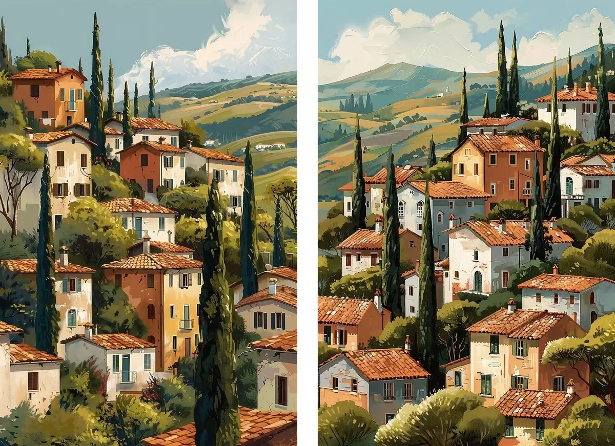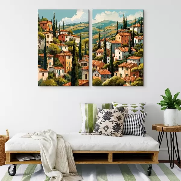 Pictură pe pânză sat mediteranean situat pe un deal, cu case în culori calde și acoperișuri din teracotă Nr m30097