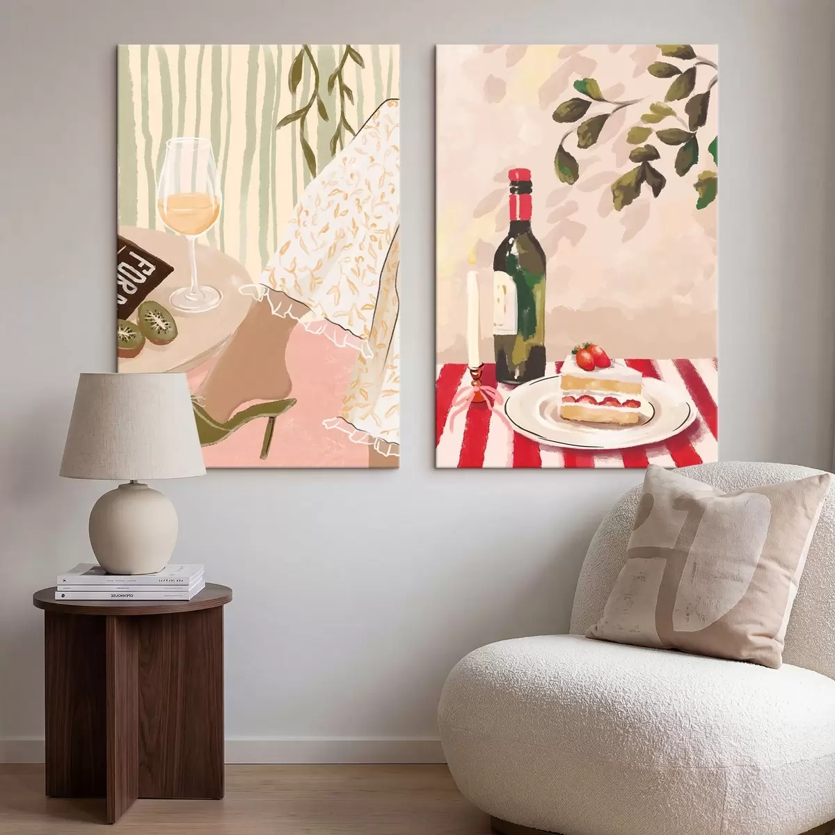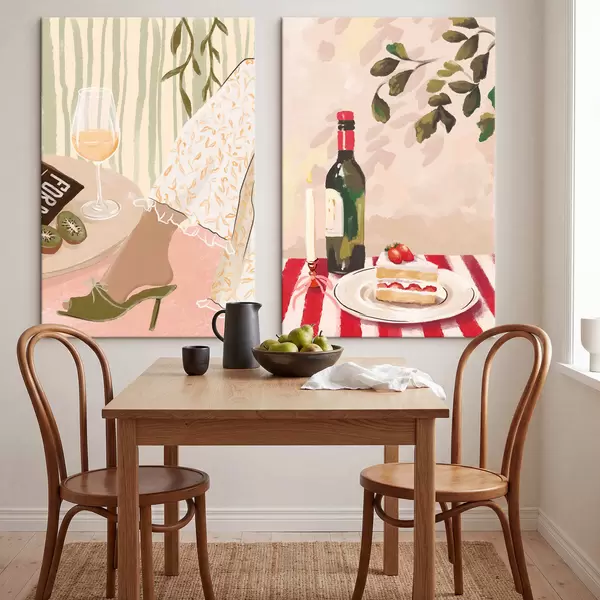 Pictură pe pânză Pahar de vin, sticlă și tort pe masă Nr m30105