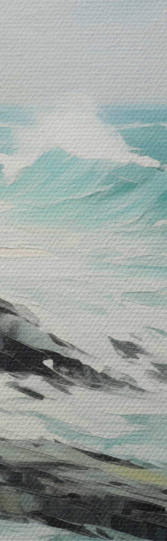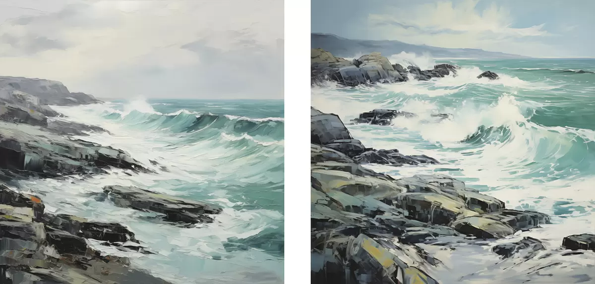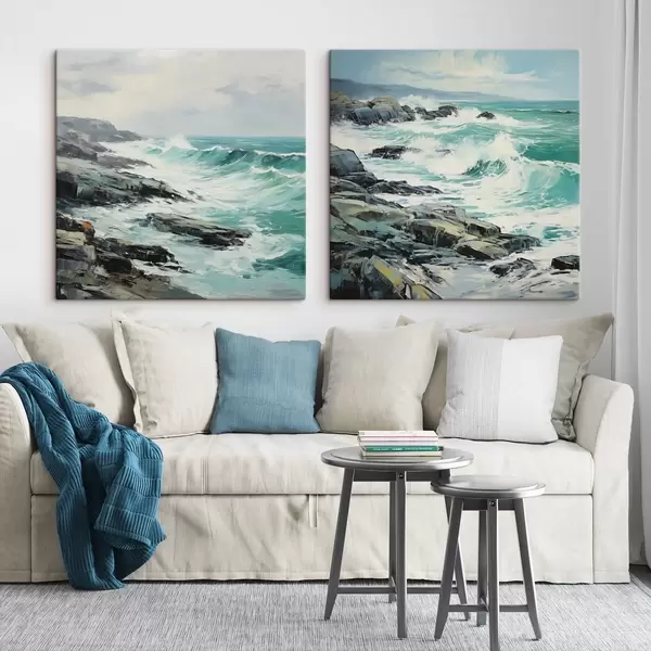 Pictură pe pânză Un peisaj cu țărm stâncos și valuri sub un cer înnorat, în stil pictural Nr m30198