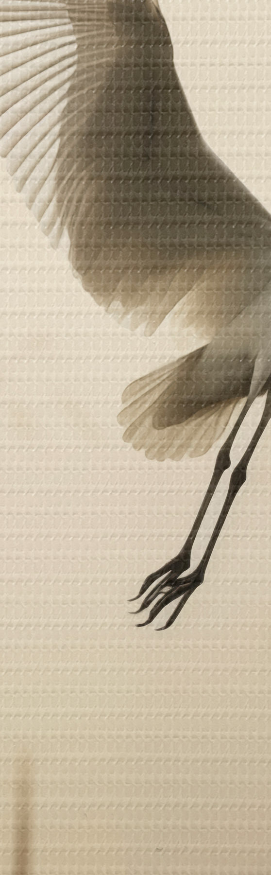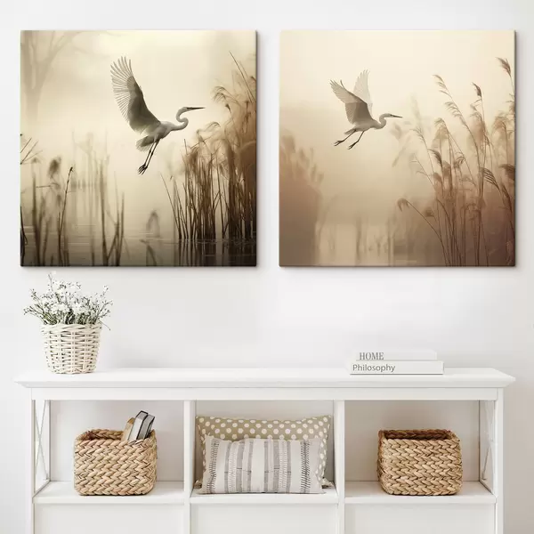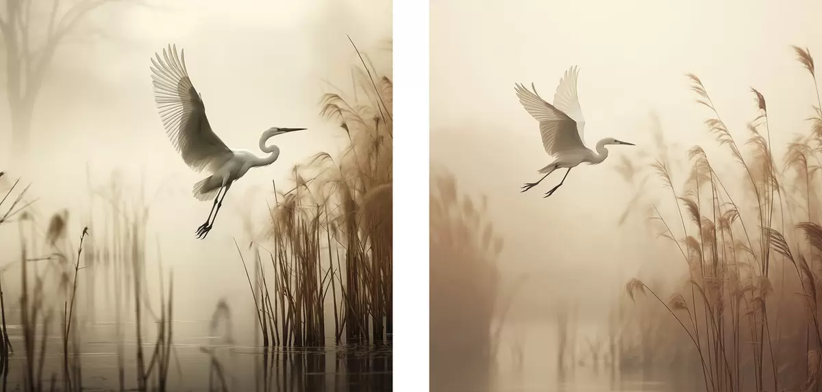 Pictură pe pânză O egretă albă zboară deasupra unui lac, înconjurată de stuf înalt și copaci în fundal Nr m30199