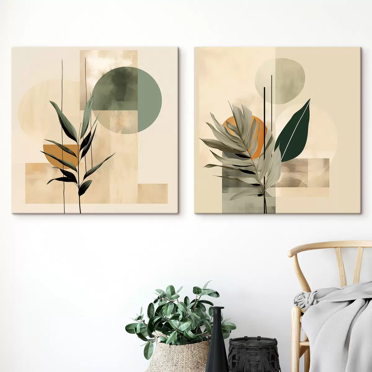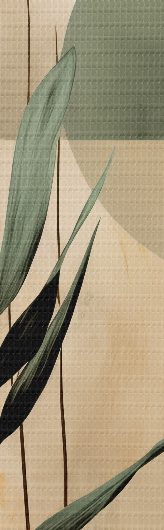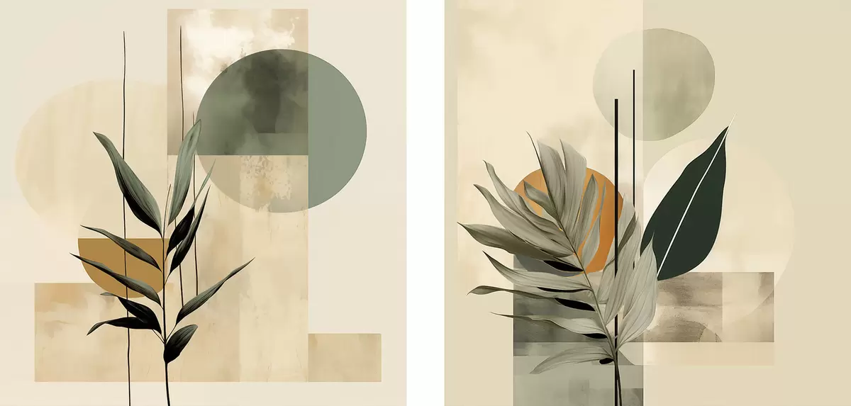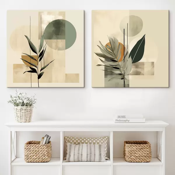 Pictură pe pânză O plantă de culoare verde închis, cu forme geometrice abstracte și texturi de acuarelă în nuanțe de bej și verde Nr m30209