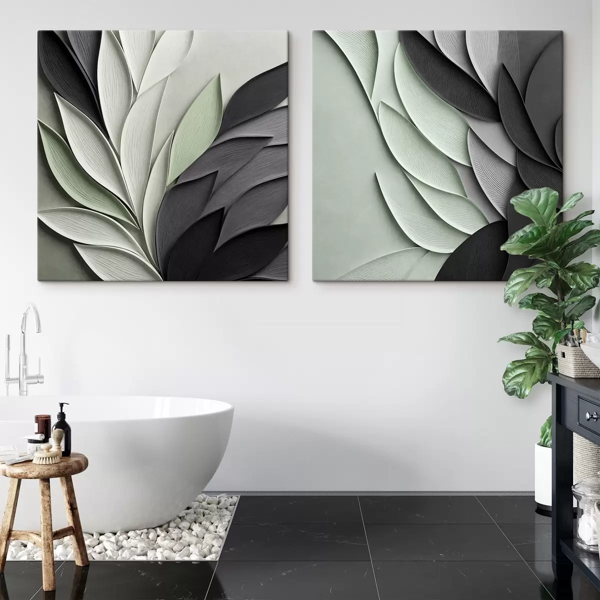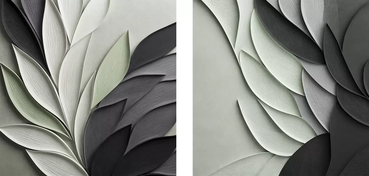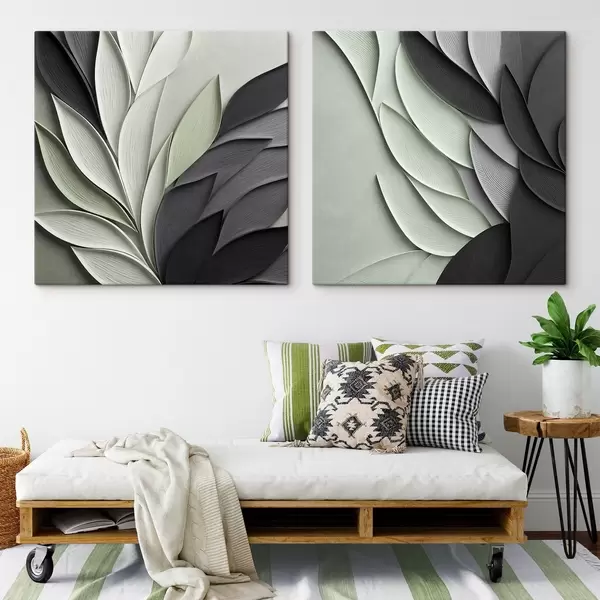 Pictură pe pânză Frunze stilizate, în nuanțe de gri, alb și verde pal Nr m30210