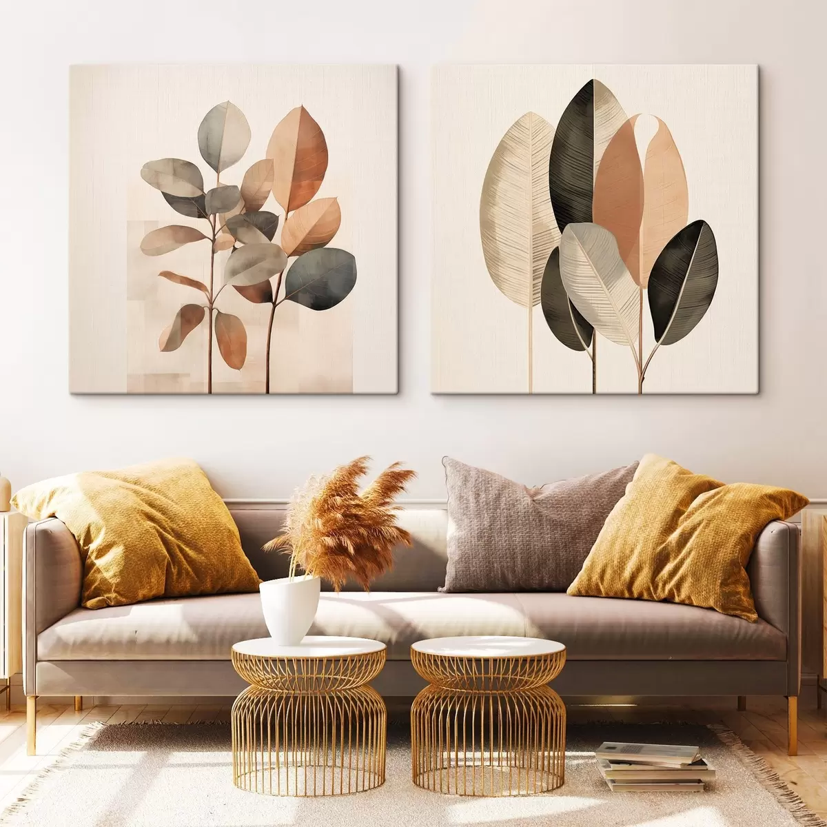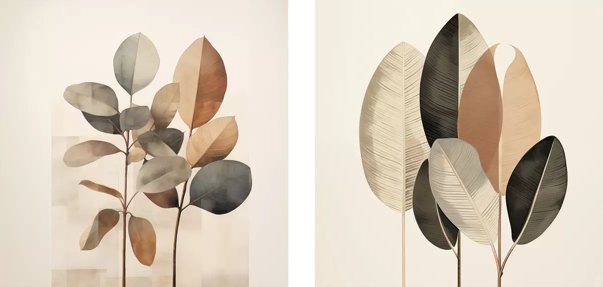 Pictură pe pânză Plante înalte cu frunze ovale, în nuanțe discrete, cu forme dreptunghiulare abstracte Nr m30211