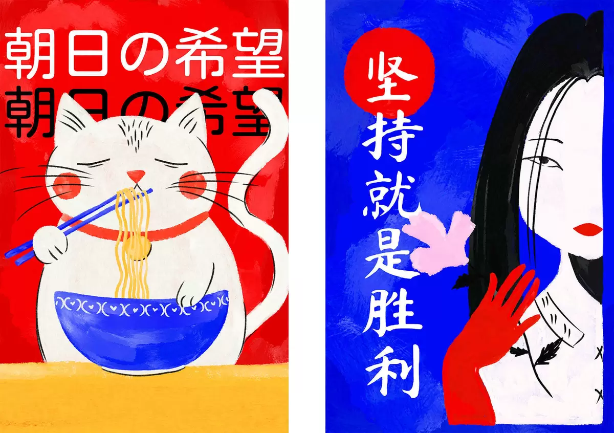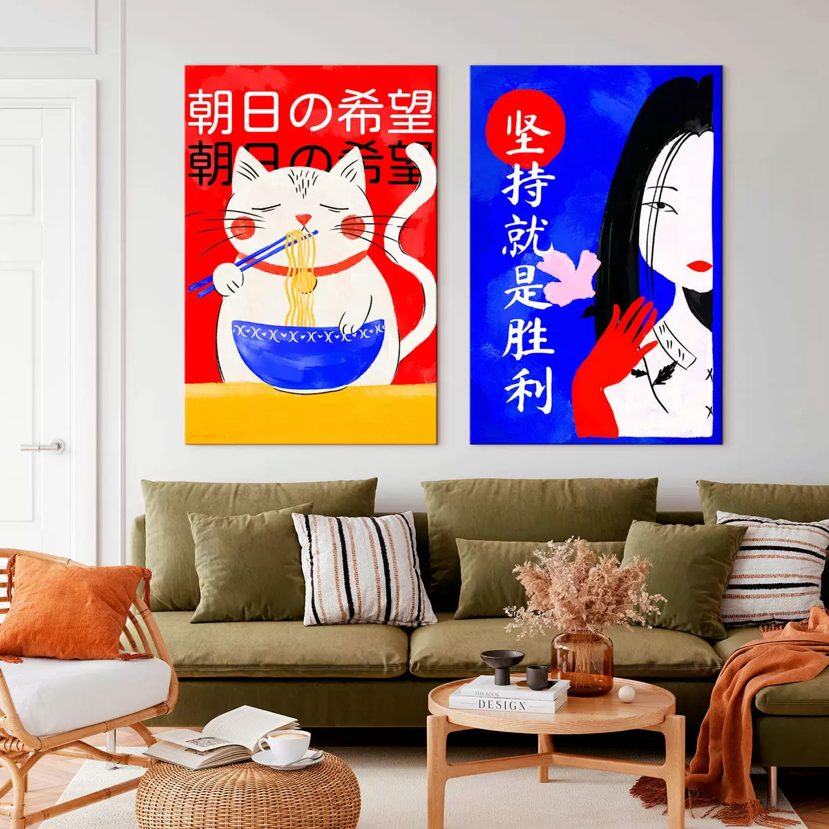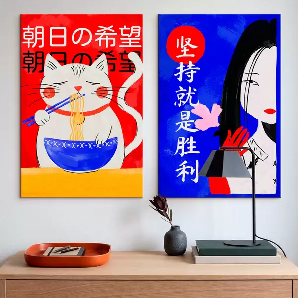 Pictură pe pânză Diptych cu portretul unei pisici și al unei femei, realizat într-un stil îndrăzneț Nr m30233