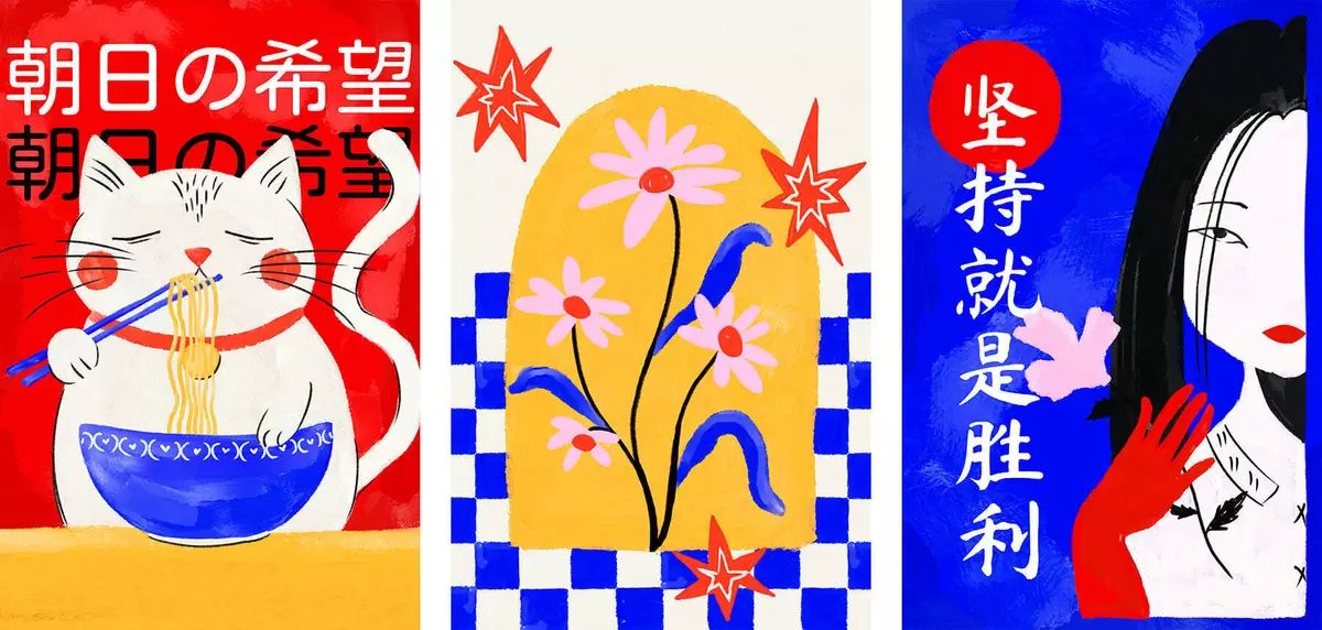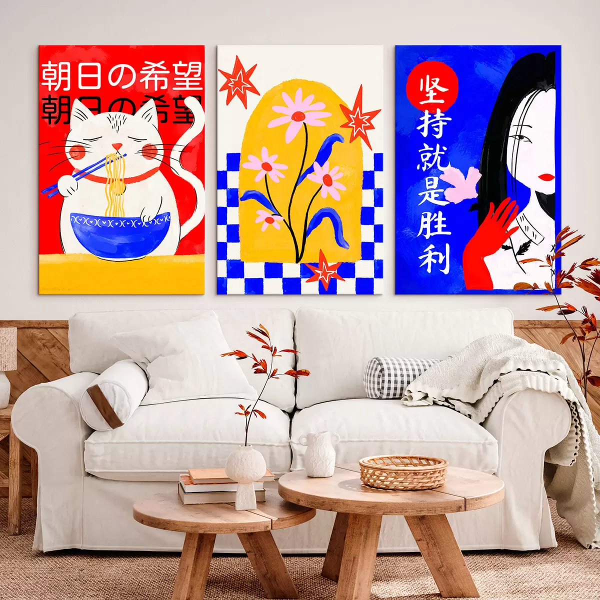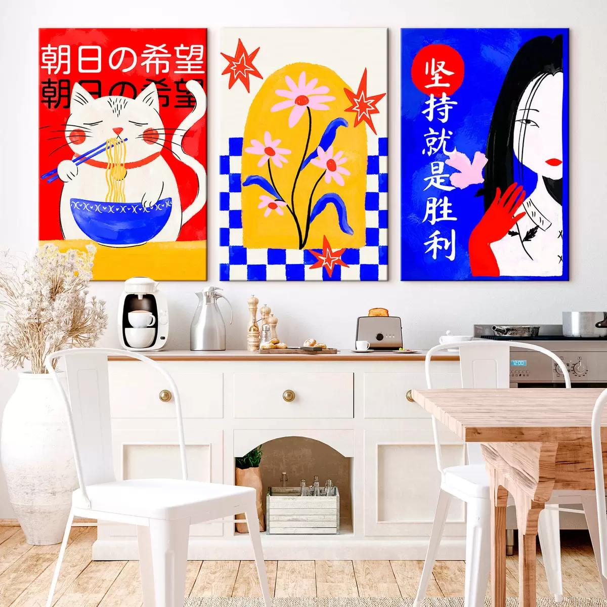 Pictură pe pânză Triptic cu o pisică, un pește și portretul unei femei Nr m30240