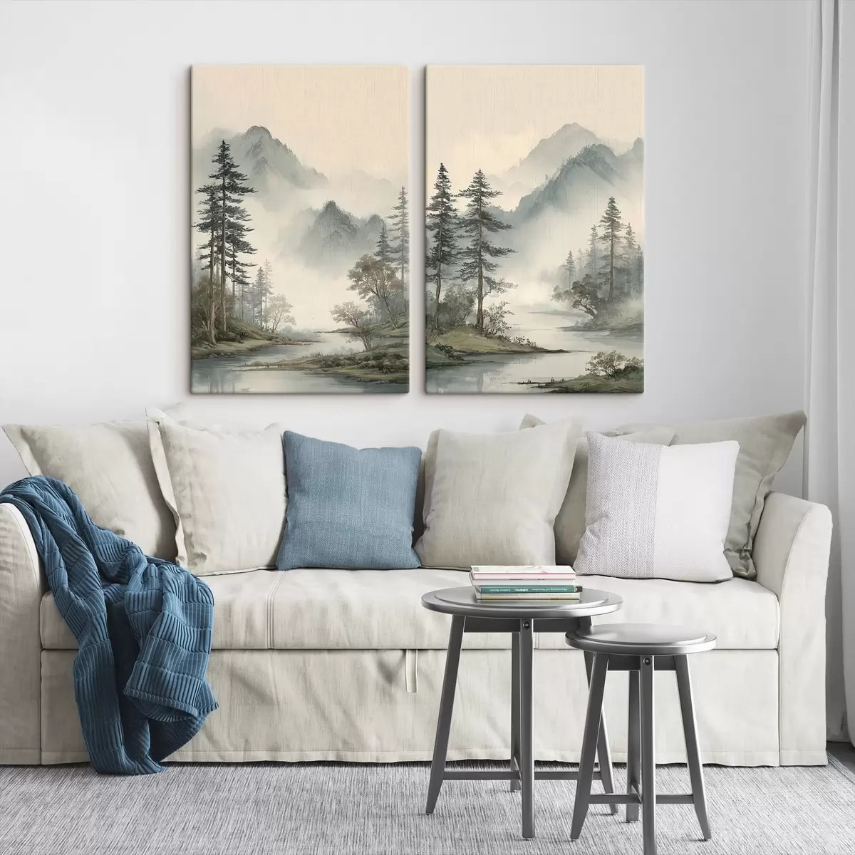 Pictură pe pânză un peisaj montan cu pini și un râu Nr m30262