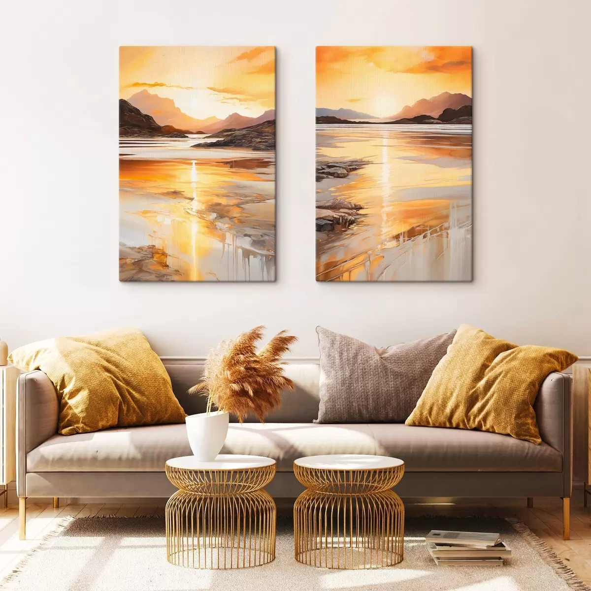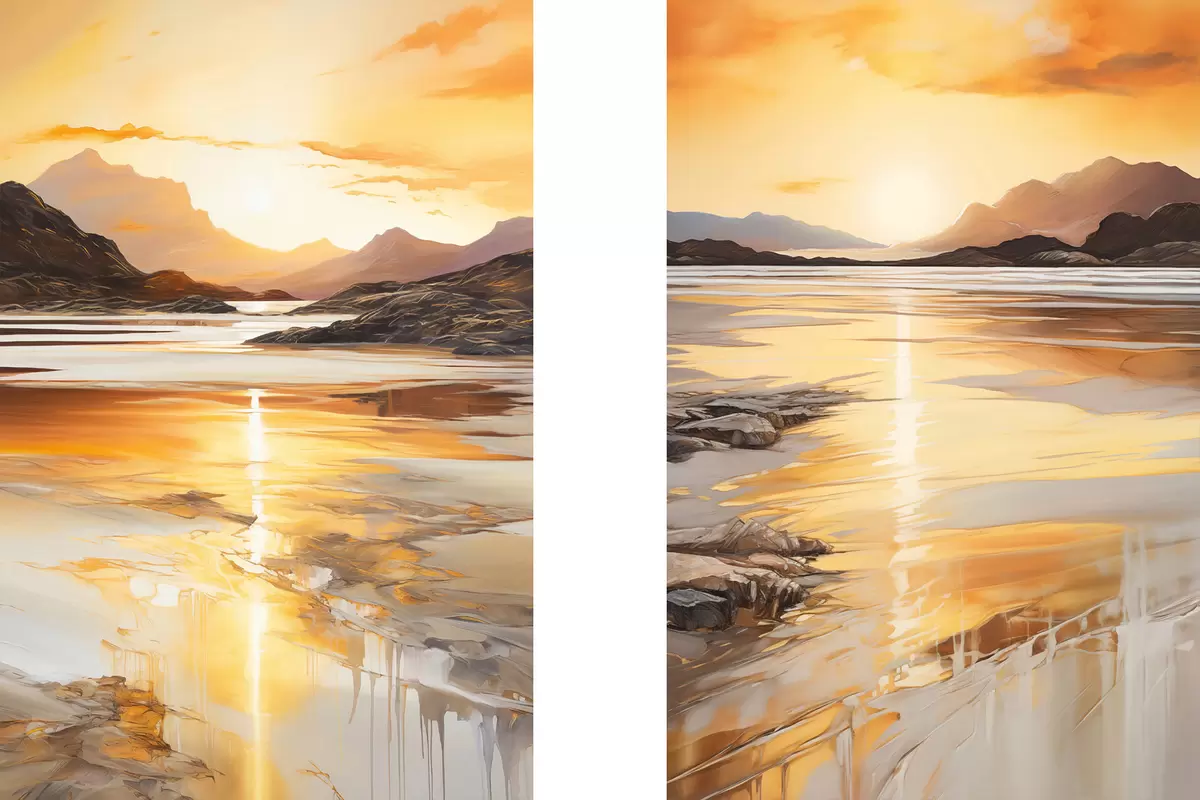 Pictură pe pânză Un peisaj cu un râu și munți sub un cer portocaliu cald, la apus Nr m30328