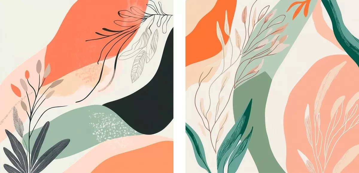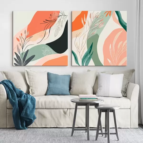 Pictură pe pânză Diptych abstract cu motive vegetale și pete de culoare, în stil modern Nr m30347