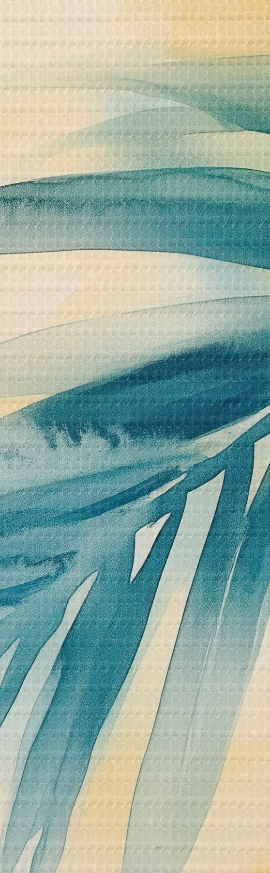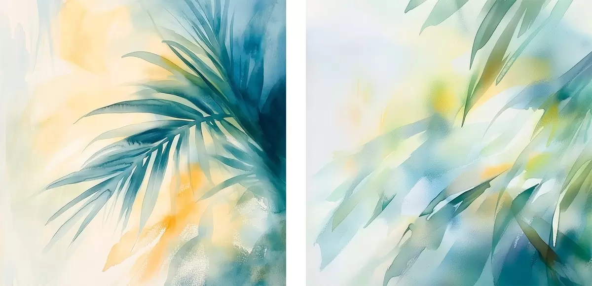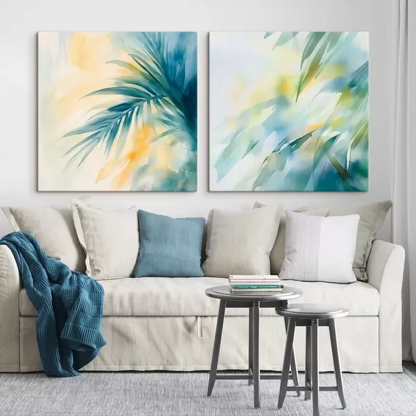 Pictură pe pânză Frunze tropicale într-o paletă de culori turcoaz și galben, în stilul efectului de acuarelă Nr m30351