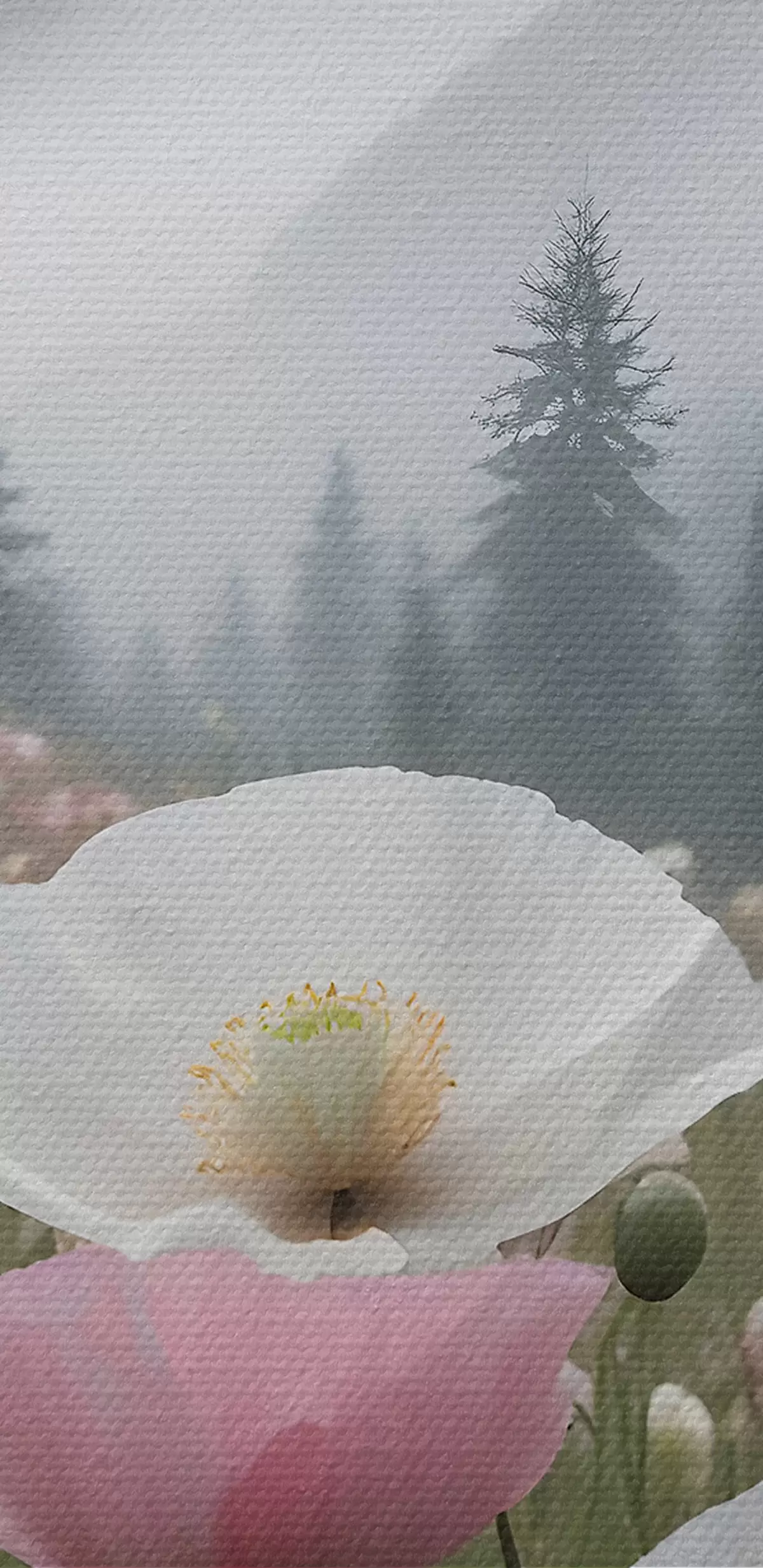 Pictură pe pânză Un câmp de maci roz și albi în peisajul montan din fundal Nr s38369
