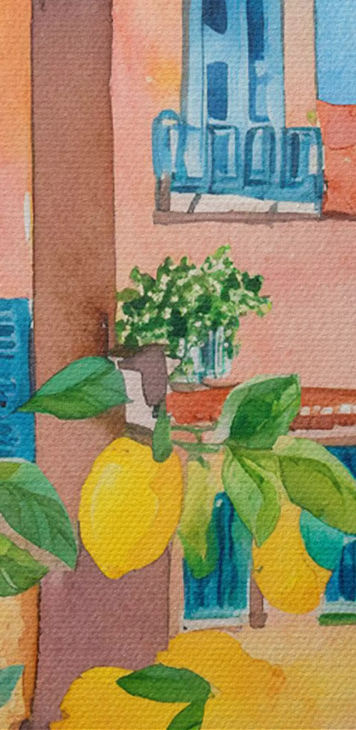 Tablouri Arhitectura orașului italian, coasta mării, vară, acuarelă, copac de lămâie s38395