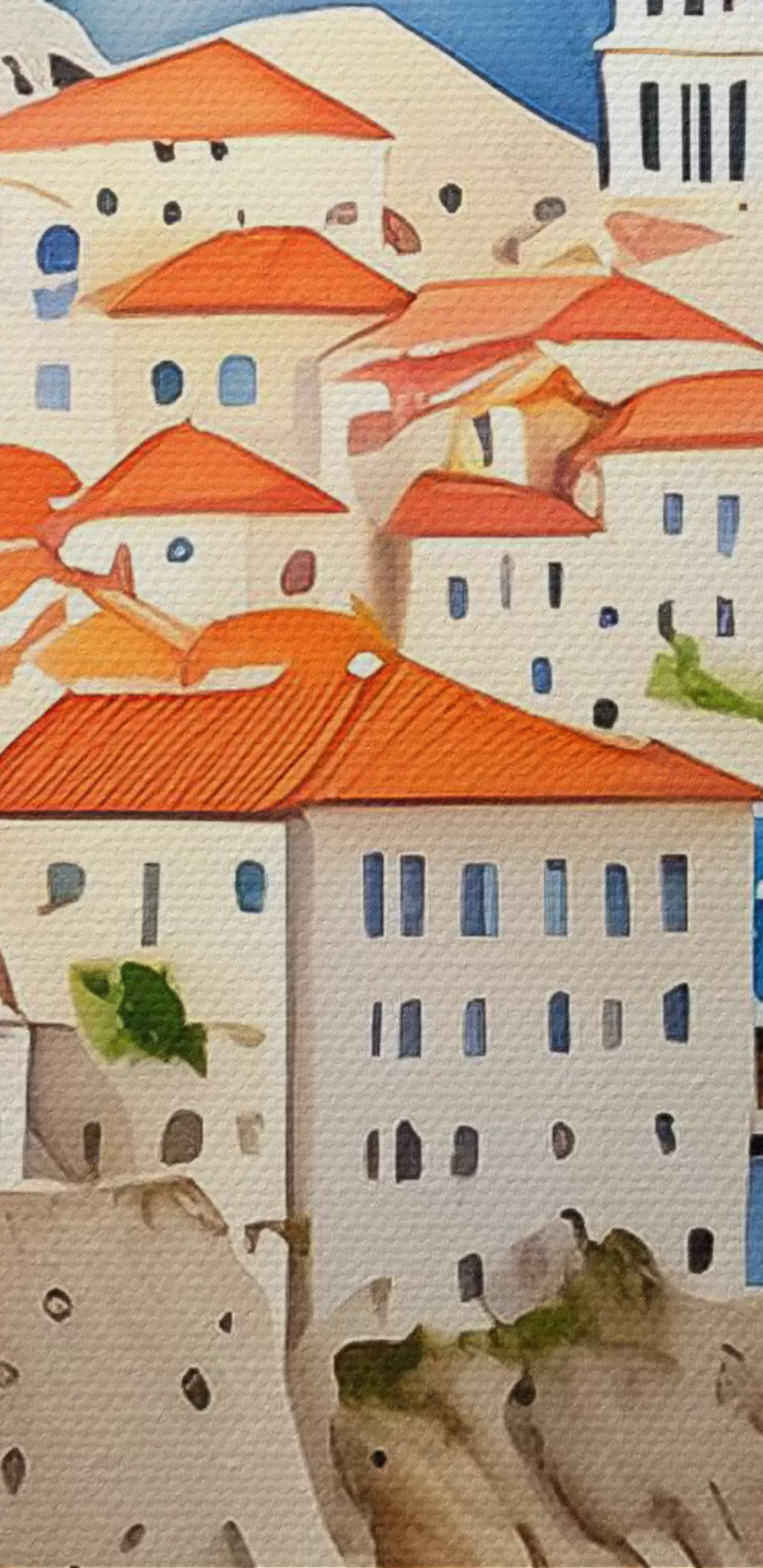Pictură pe pânză Arhitectură mediteraneană, acuarelă, flori de vară, mare albastră, munți Nr s38408
