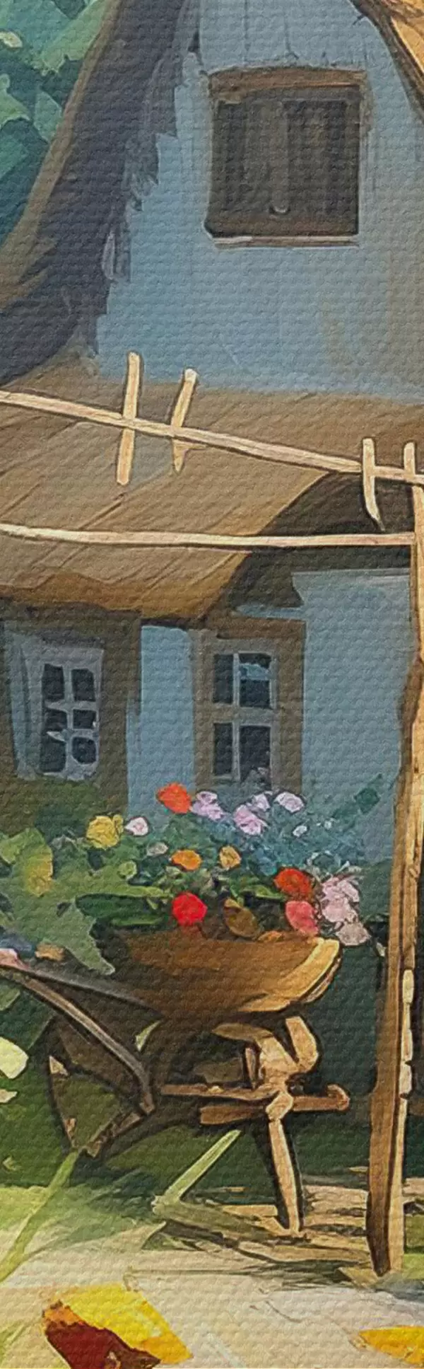 Pictură pe pânză Casă de sat cu grădină, flori de vară, vopsea olil, lovituri de perie, câmp, stil rustic Nr s38491