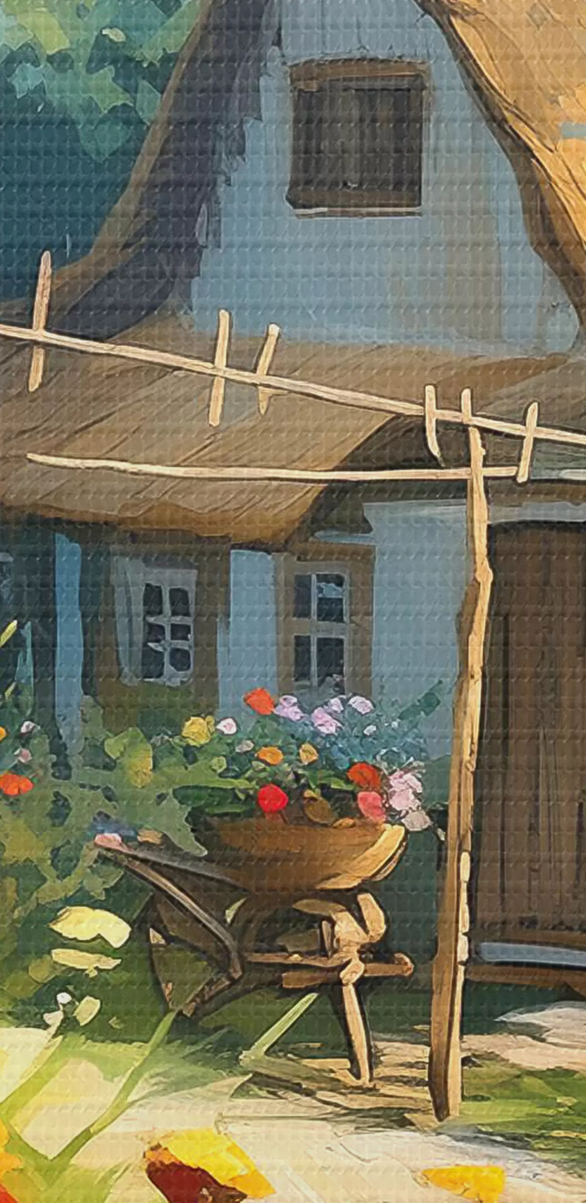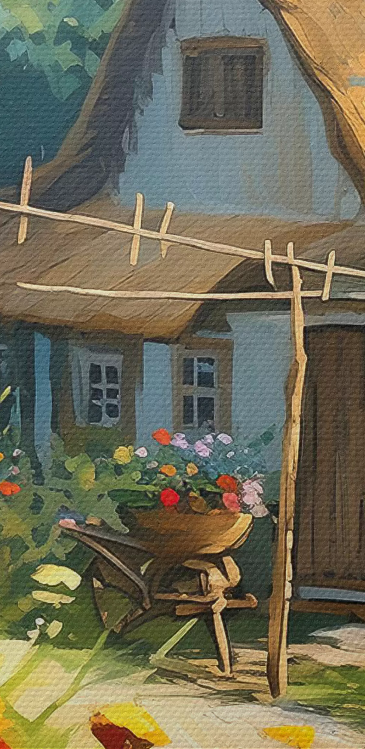 Tablouri Casă de sat cu grădină, flori de vară, vopsea olil, lovituri de perie, câmp, stil rustic s38491