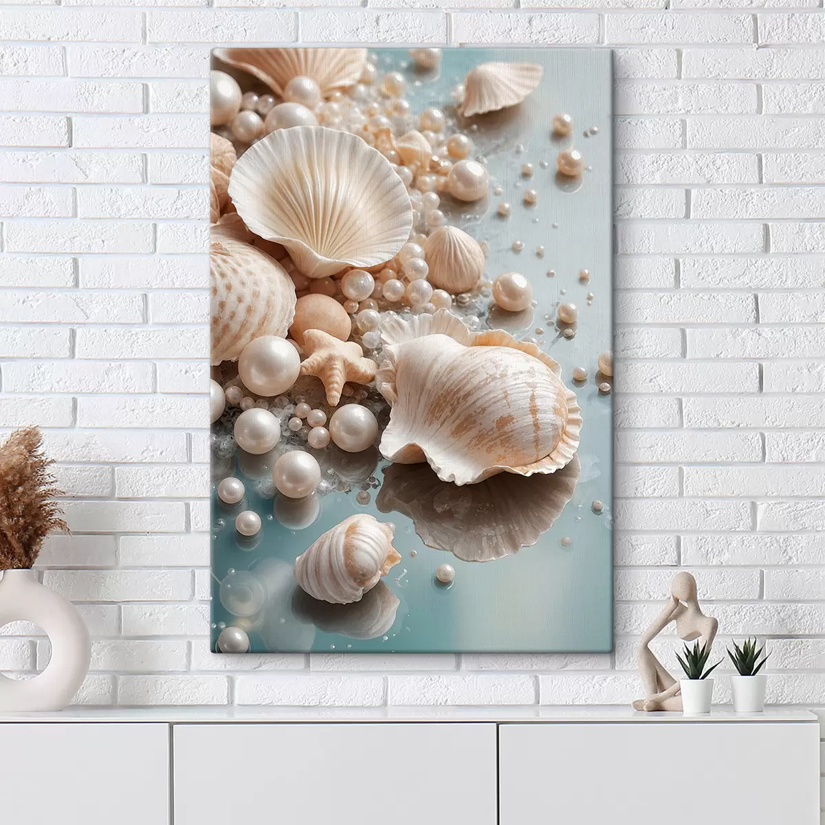 Pictură pe pânză Scoici asortate și perle pe un fundal albastru deschis Nr s38769