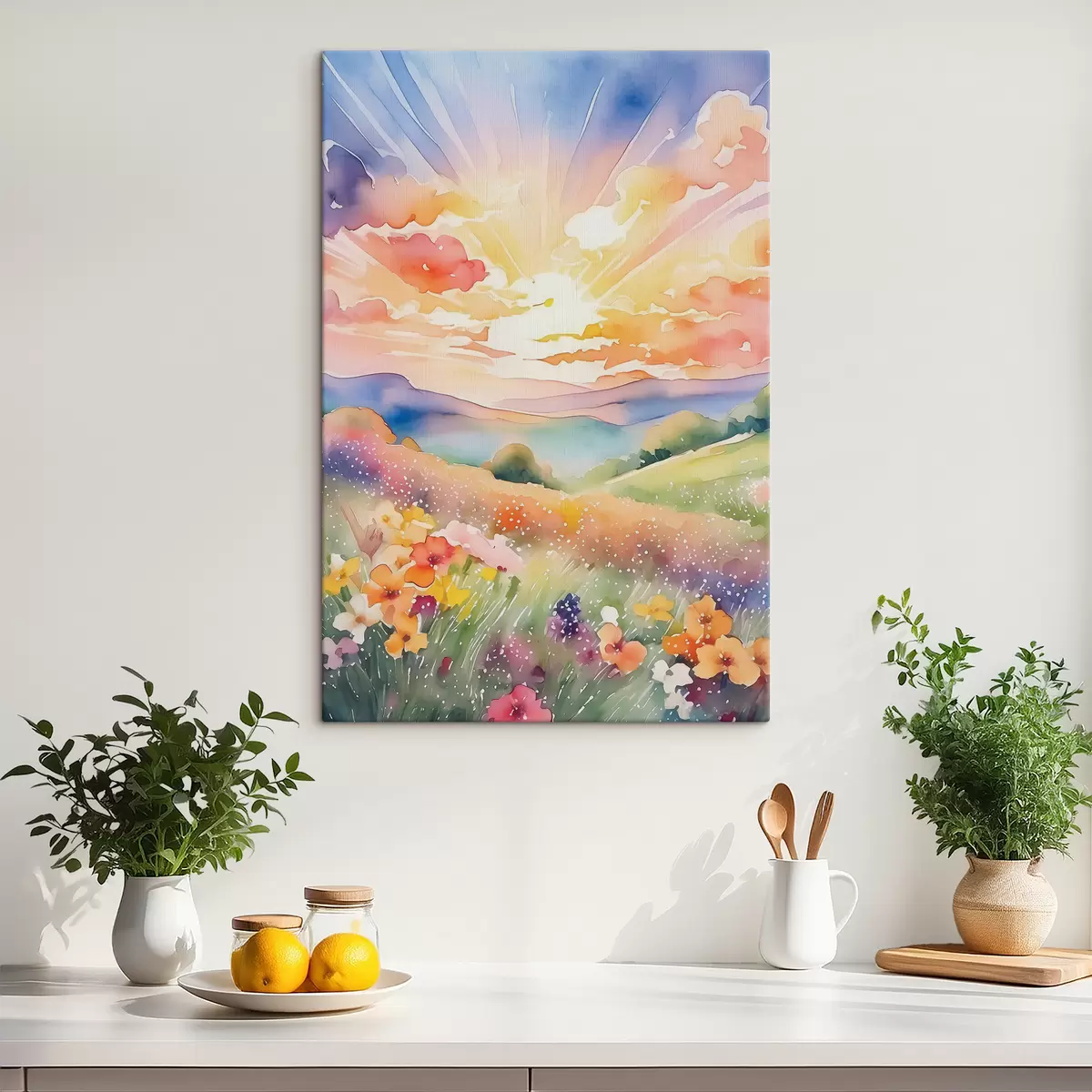Pictură pe pânză Apus de soare în câmpul de vară, flori, soare, cer colorat, nori, natură Nr s38842