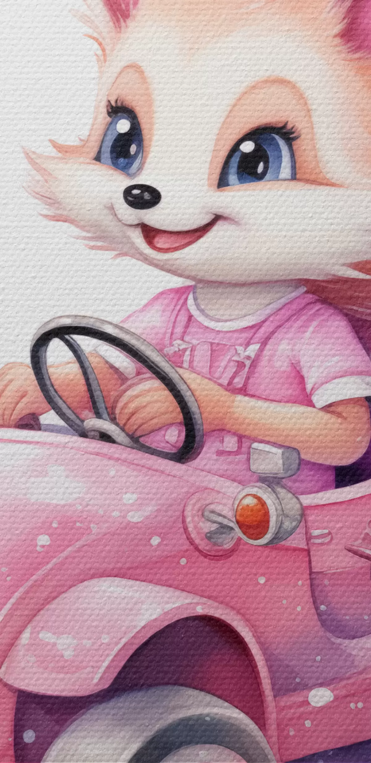 Pictură pe pânză Mica vulpe călărește o mașină roz ilustrație acuarelă pentru copii Nr s38943