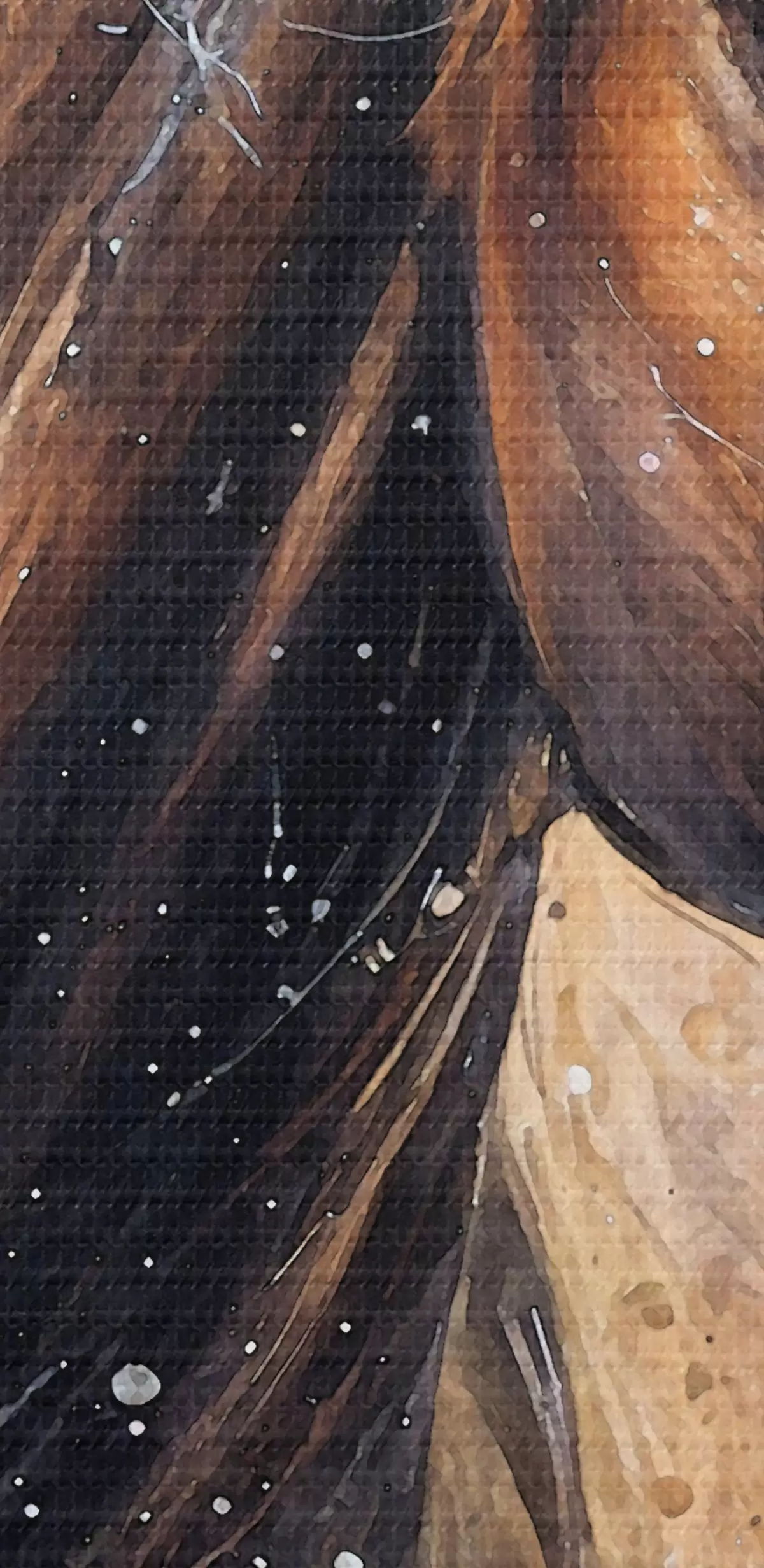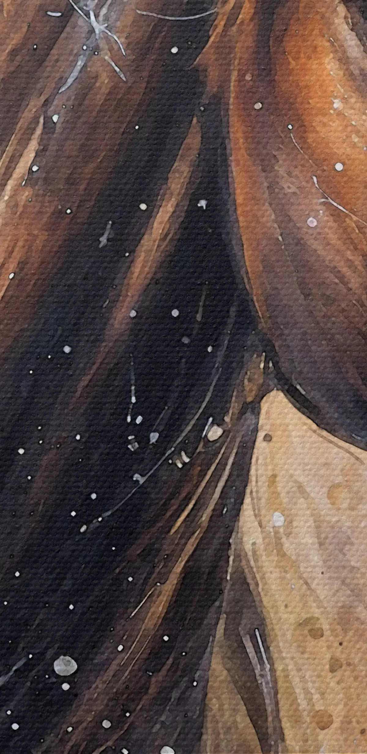 Tablouri Pictură a unui cal maro cu coamă fluidă, pe un fundal texturat cu stropi de culoare s38959