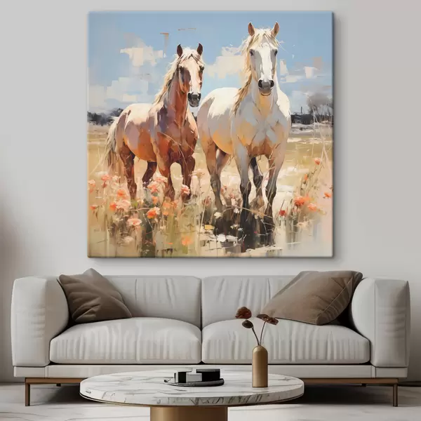 Pictură pe pânză Cai albi și maro pasc într-o pajiște printre flori sălbatice pictură în ulei artă abstractă Nr s39187