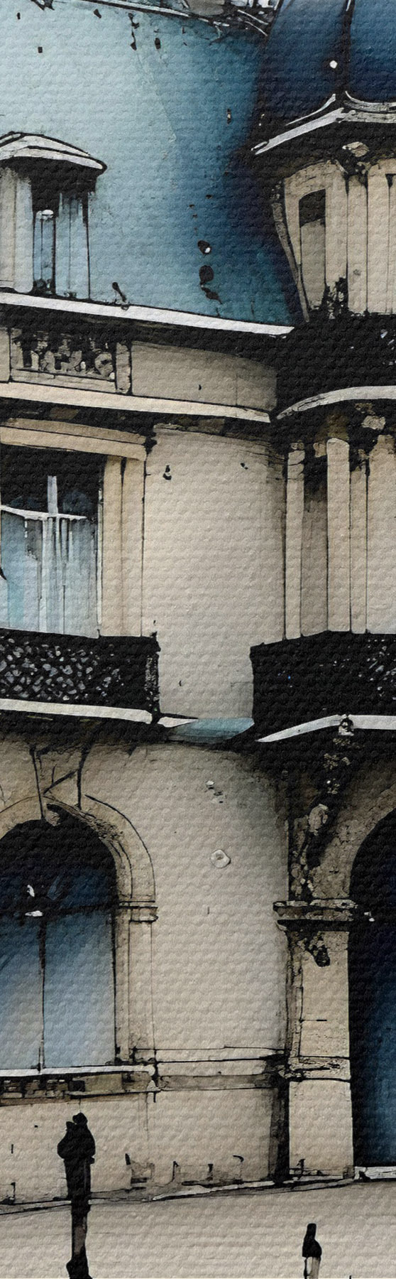 Pictură pe pânză O clădire mare acuarelă de artă înconjurat de stâlpi de iluminat și copaci, pe o zi ploioasă Nr s39391