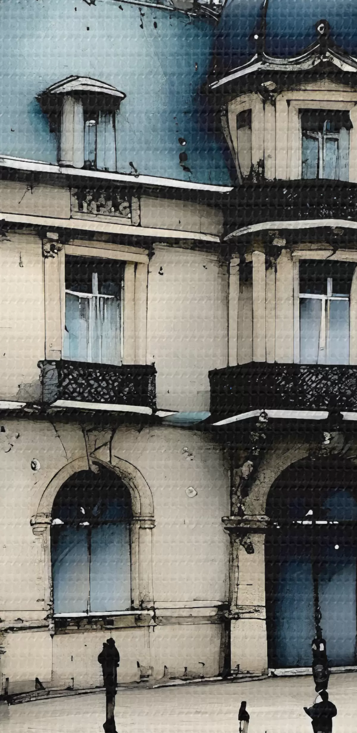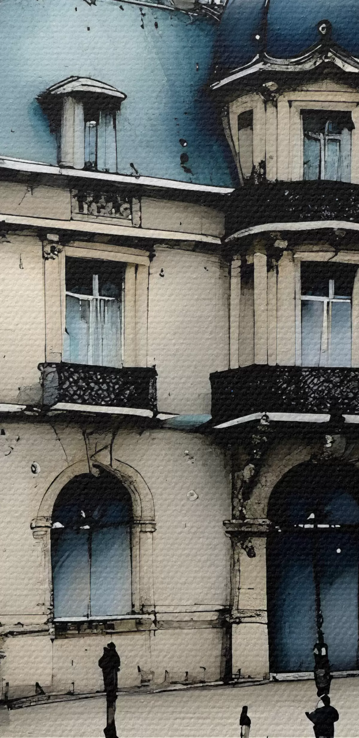 Tablouri O clădire mare acuarelă de artă înconjurat de stâlpi de iluminat și copaci, pe o zi ploioasă s39391